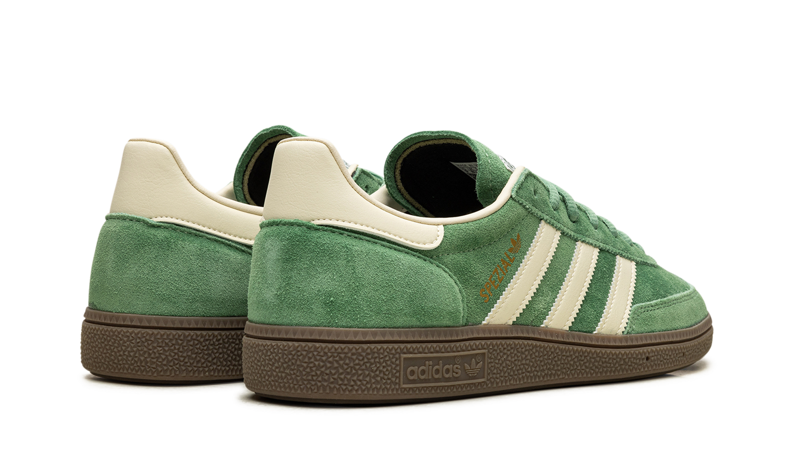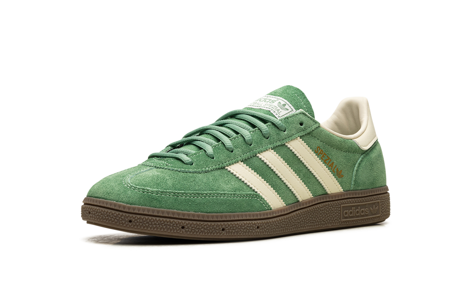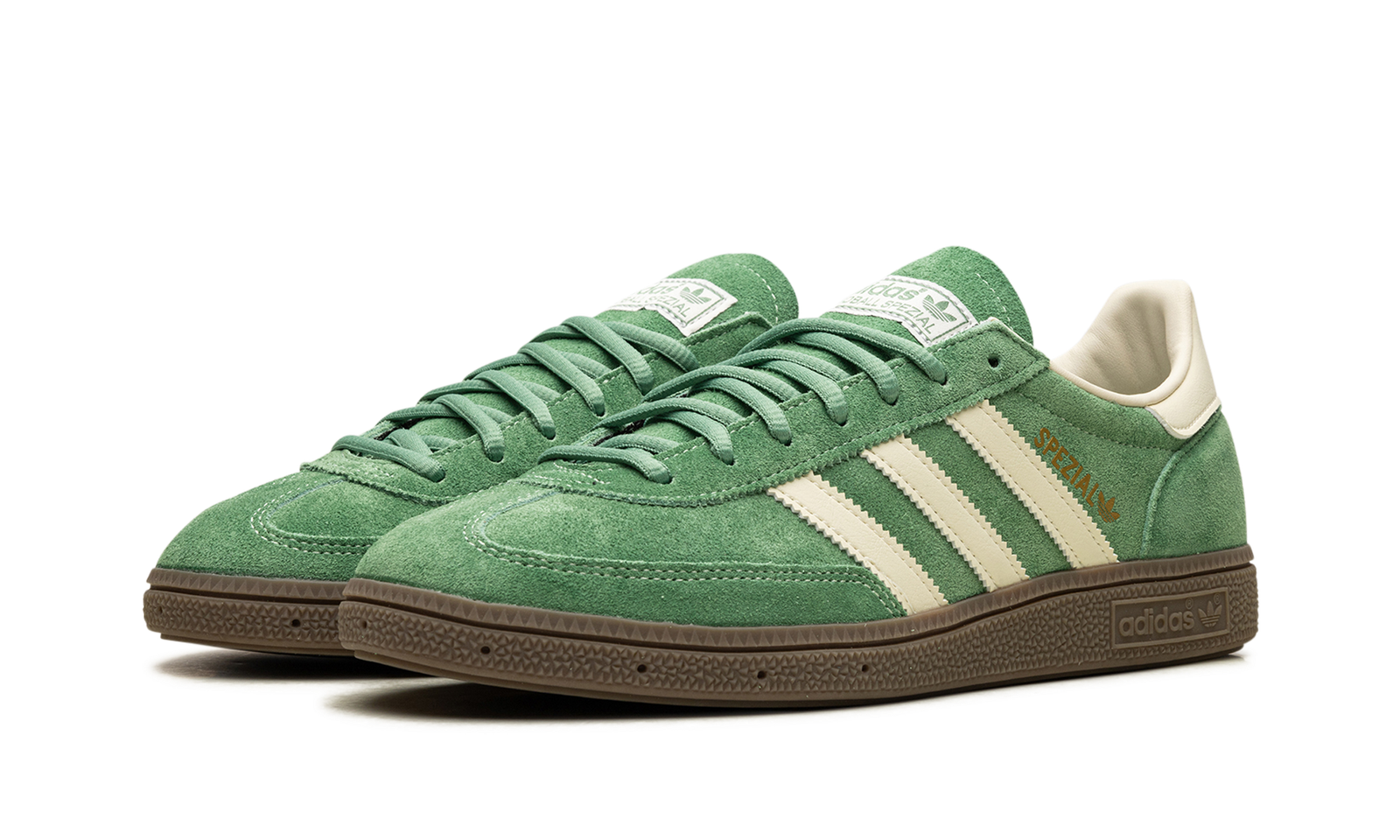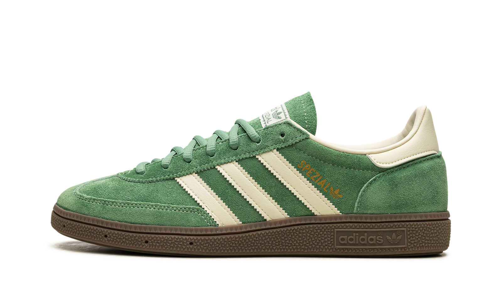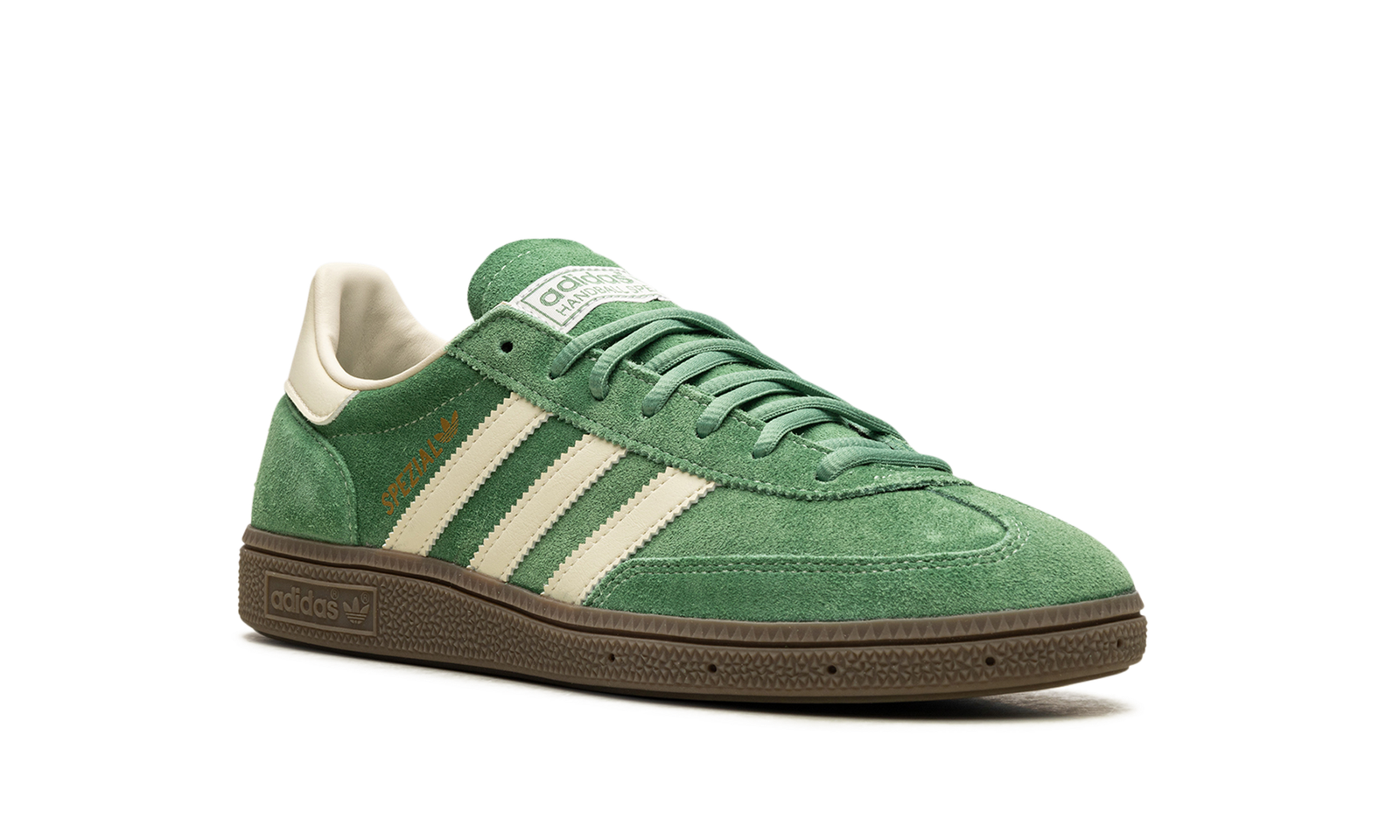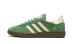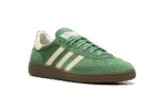 The adidas Handball Spezial “Preloved Green” is a green-based colorway of the classic sneaker. The “Preloved Green” adidas Handball Spezial features a slightly faded green suede construction with tonal suede overlays. Cream leather Three Stripes branding on the sides. Gold “Spezial” and adidas Trefoil logos appear on the lateral side of the mid-panel, while “adidas” branding appears on the white leather heel tab. A brown sole completes the look. Release date: March 1, 2024