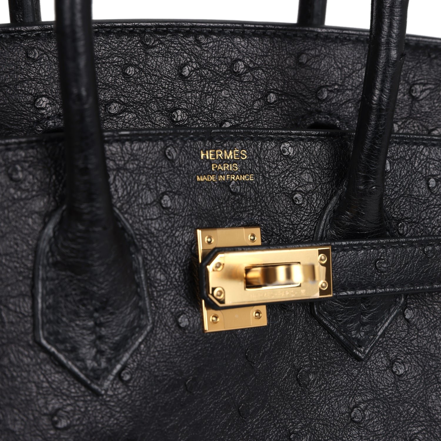 This Birkin is in Black ostrich with gold hardware and features tonal stitching,front flap, two straps withcentertoggle closure, clochette with lock and two keys, and double rolled handles.