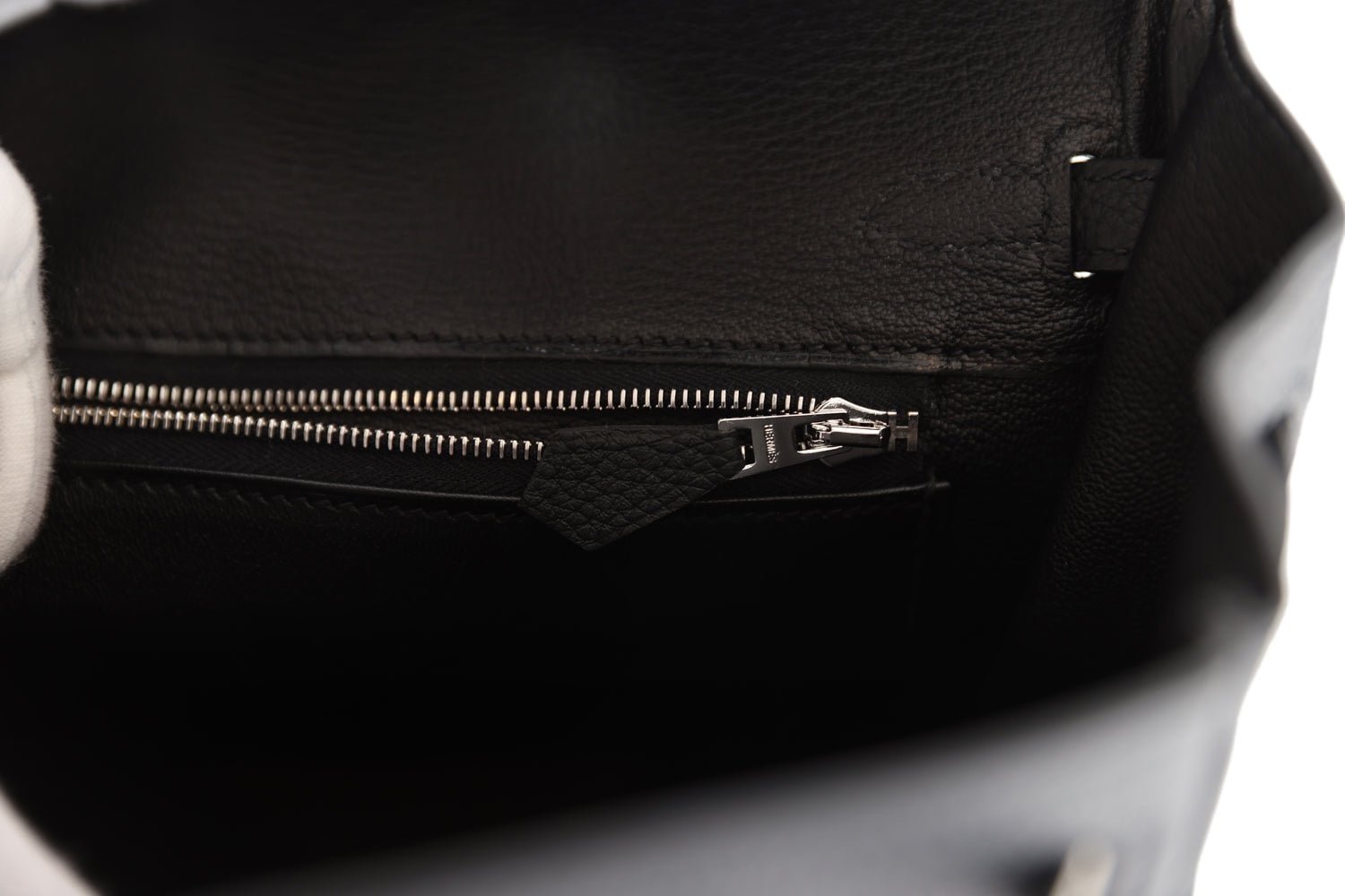 The interior is lined with black chevre and has a zip pocket with an Hermès engraved zipper pull and an open pocket on the opposite side.