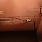 The interior is lined with Gold swift leather and has one zip pocket with an Hermès engraved zipper pull and an open pocket on the opposite side.