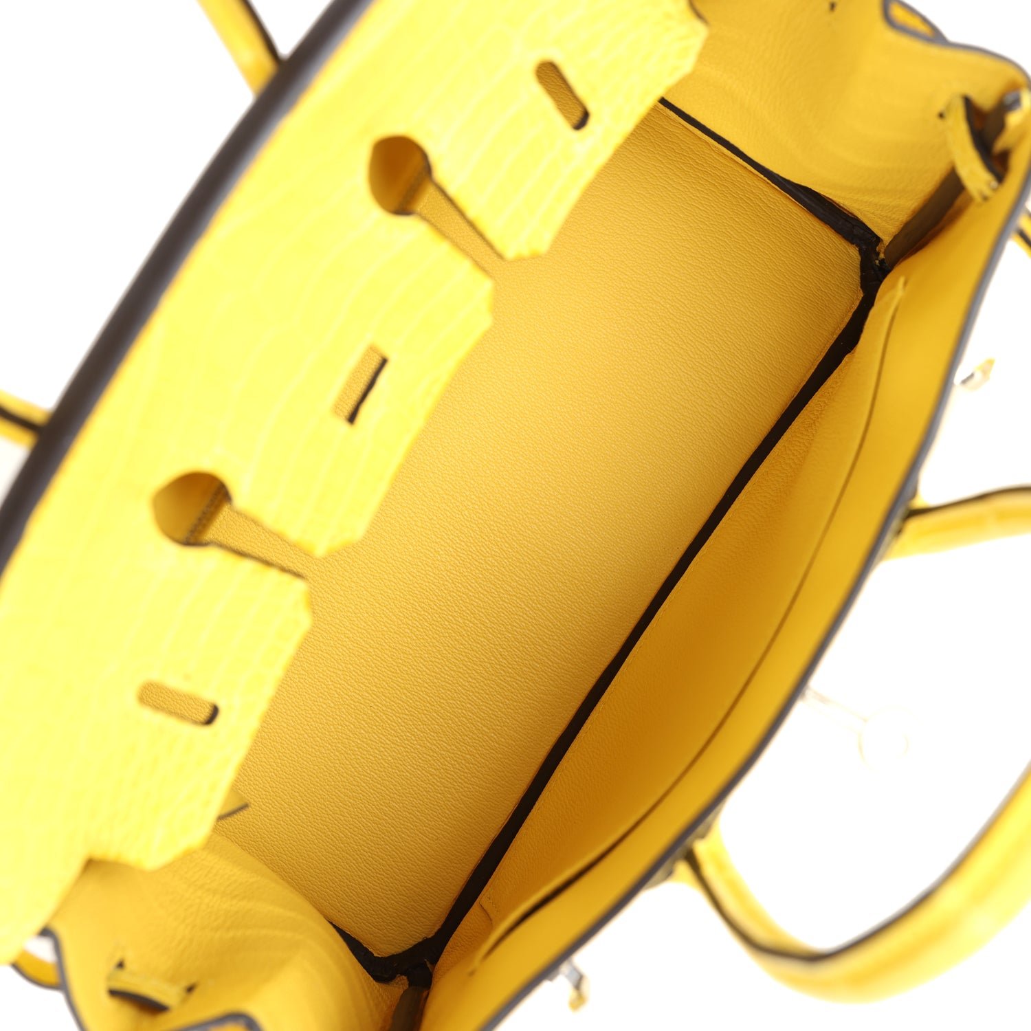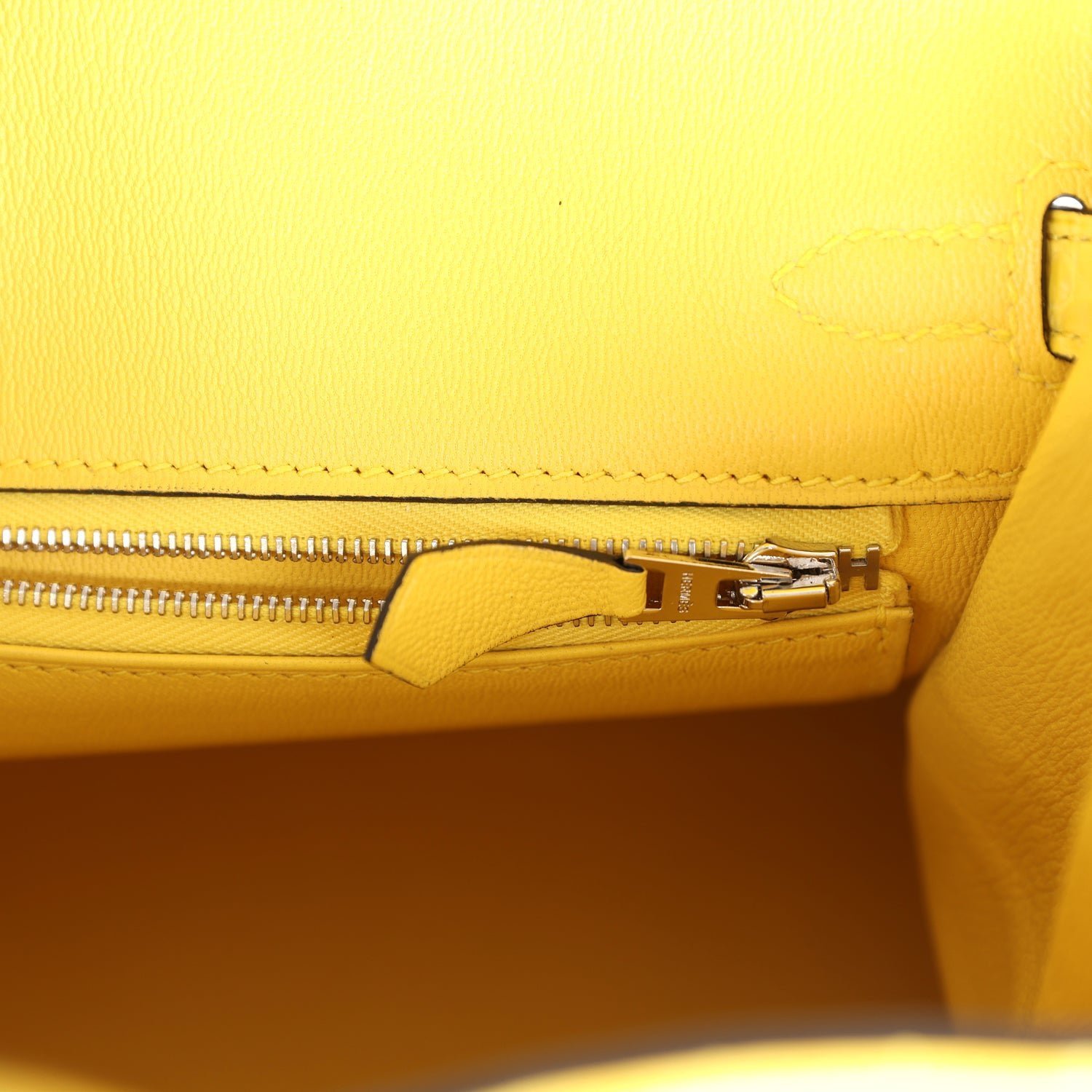 The interior is lined in Mimosa chevre leather and has one zip pocket with Hermès engraved pull and a pocket on the opposite side.
