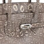 This Birkin is inOmbre shiny Salvator lizardwithpalladium hardware and has tonal stitching, front strap, two straps with center toggle closure, clochette with lock and two keys and double rolled handles.