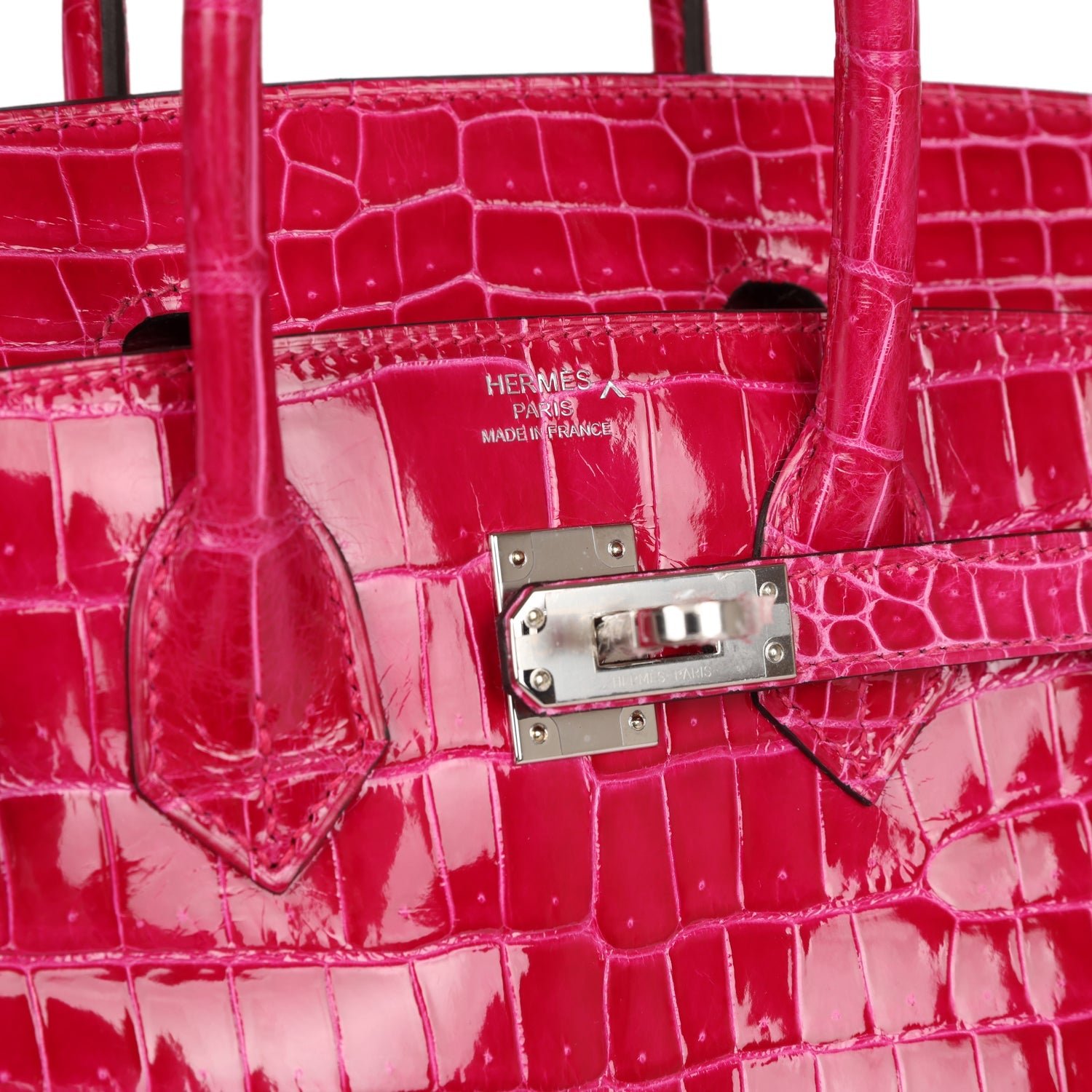 This Birkin is inRose Mexico shinyPorosuscrocodile leather withpalladium hardware and has tonal stitching, front strap, two straps with center toggle closure, clochette with lock and two keys and double rolled handles.