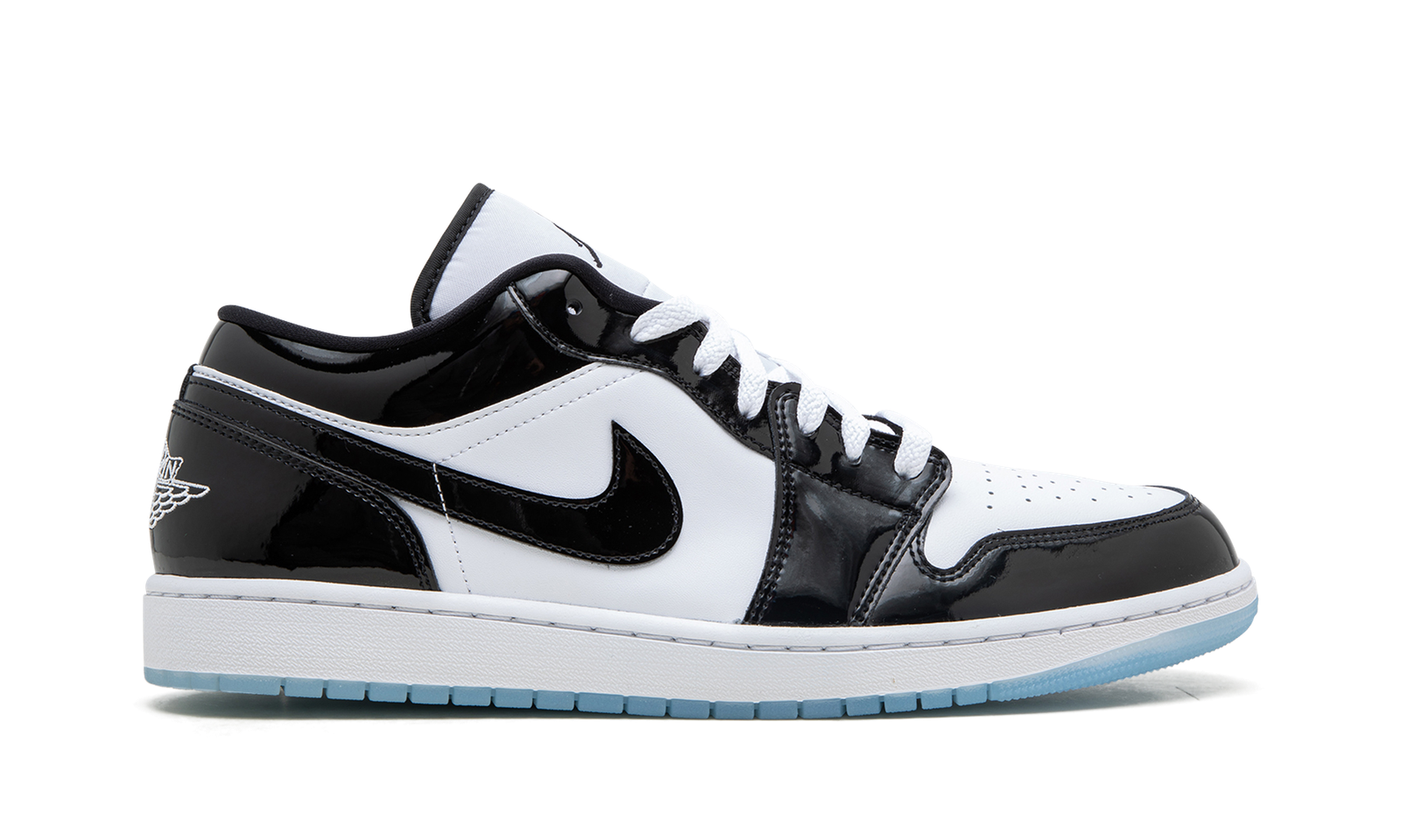 The Air Jordan 1 Low SE “Concord” is a colorway of the classic sneaker that is inspired by the popular Air Jordan 11 style of the same nickname. The Jordan 11 “Concord” is an original colorway in the Air Jordan line, and one of the most desirable sneakers in the world. Here, the Jordan 1 Low SE incorporates elements of the shoe into its design in a unique and appealing way. The upper features a white leather base with contrasting black patent leather on the overlay panels and Swoosh. “Wings” branding is embroidered on the heel. A black Jumpman appears on the tongue. The white rubber midsole and icy blue translucent outsole complete the look. Release date: January 17, 2023