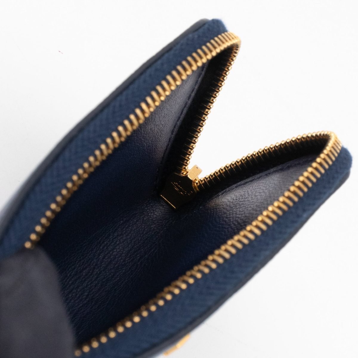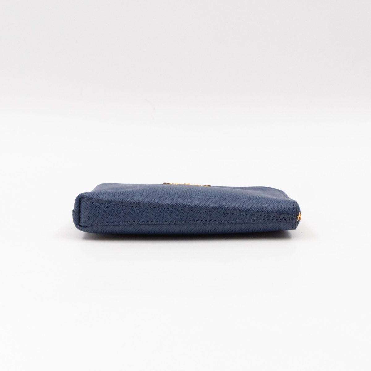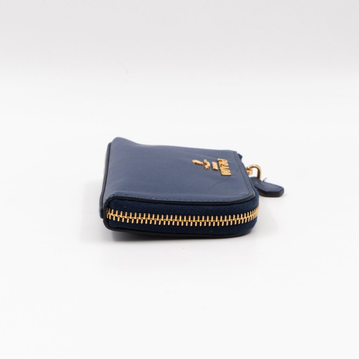 A practical mini Key Pouch from Prada. This everyday accessory is made with blue saffiano leather, it has zipper closure and a key ring on chain inside. Attach it your bag or keep it in your pocket. It fits keys, coins and even bank cards.