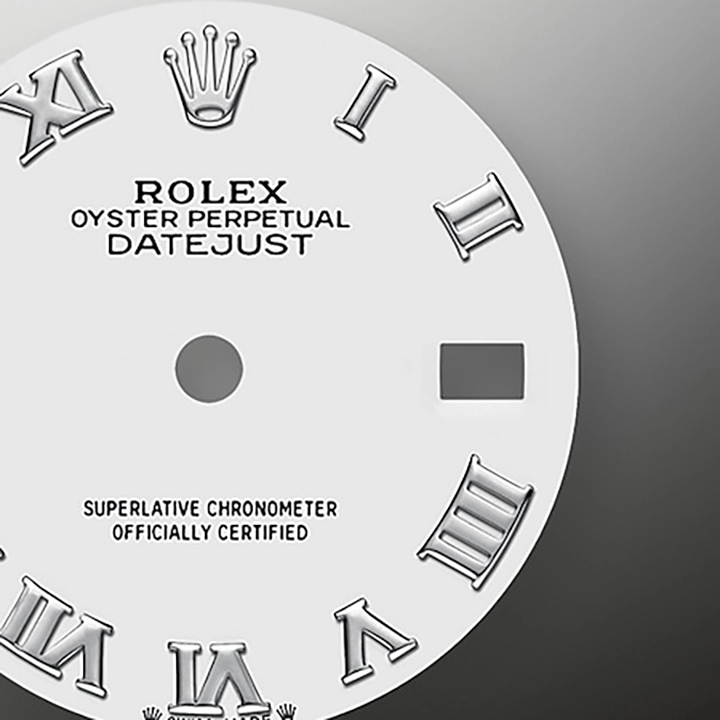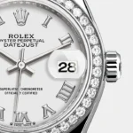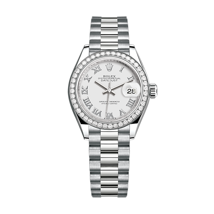 The light reflections on the case sides and lugs highlight the elegant profile of the 28 mm Oyster case, which is fitted with a diamond-set bezel. Rolex’s classic feminine watch, the Lady-Datejust is in the lineage of the Datejust, the emblematic model that has been a byword for style and accurate timekeeping.