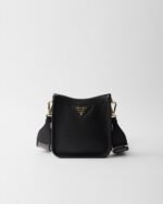This versatile leather bag boasts a sleek and functional design. The shoulder strap adds a sporty element to the accessory, elevated by the metal logo lettering that stands out on the simple yet distinctive geometry of the iconic triangle.