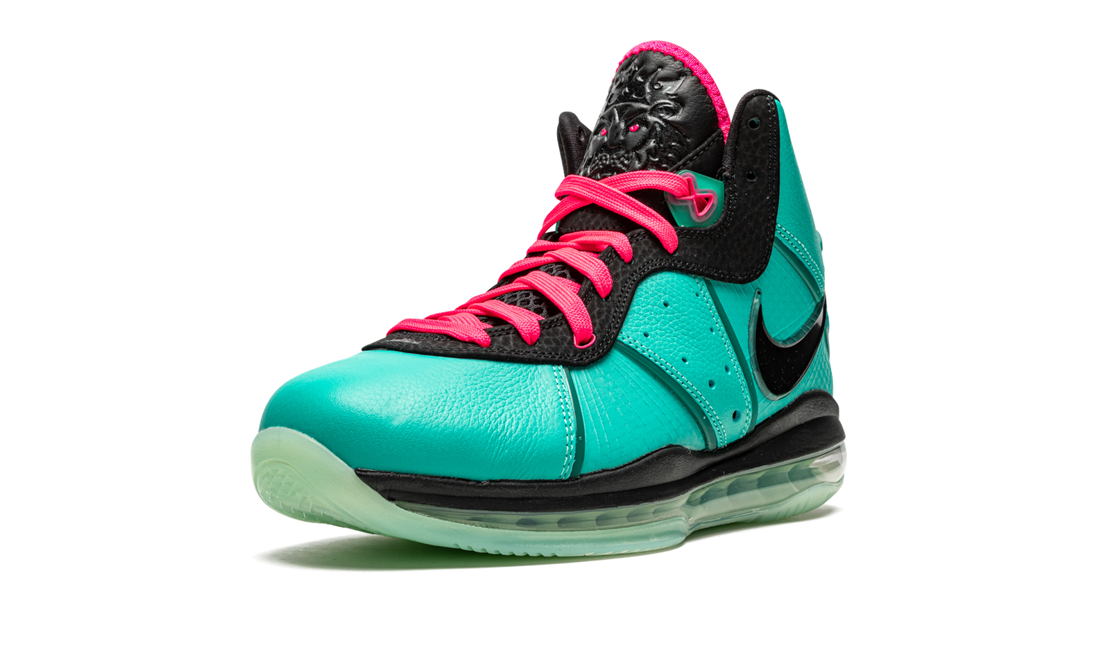 The Nike LeBron 8 “South Beach 2021” is a modern re-release of perhaps the most iconic colorway in LeBron James’ signature shoe collection with Nike Basketball. Launching as a pre-heat colorway prior to LeBron’s tenure with the Miami Heat in 2010, the “South Beach” Nike LeBron 8 played an important role in advancing sneaker culture from what was then a niche hobby into the mainstream. It’s easy to see how based on the shoe’s neck breaking, “Miami Vice” inspired teal-and-pink color block. Arriving in true-to-original fashion, the Spring 2021 release features a Filament Green synthetic leather construction supported by what was Nike’s then-new supportive Flywire technology. Perforations on either side provide airflow to the foot. A glossy black synthetic Swoosh appears on the lateral side of the heel. James’s signature appears in Nike’s decidedly electric Pink Flash hue on the carbon fiber overlay on the back of the shoe. Bright flamingo-style laces sit on the black mesh tongue. LeBron’s signature Nike lion motif is embossed on the top of the black tongue. Underneath, a full-length visible Max Air unit provides a cushioned and responsive ride. Release date: May 2021.