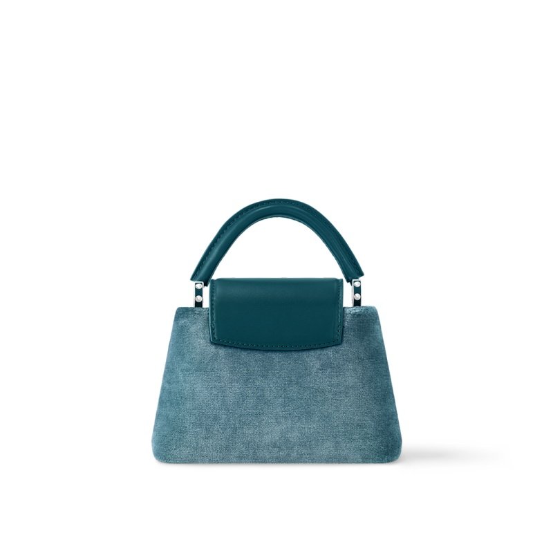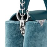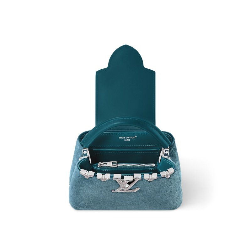 The Capucines Flower Crown story returns for the festive season with this statement Mini version in crushed velvet, with a Flower Crown and LV signature embellished with glittering, hand-set colored strass and completed with silver-toned hardware. It has a compartmented interior with a flat pocket and enough space to fit a smartphone and other evening essentials. Carry it by hand or attach the shoulder strap with an elegant braided chain to wear it cross-body.