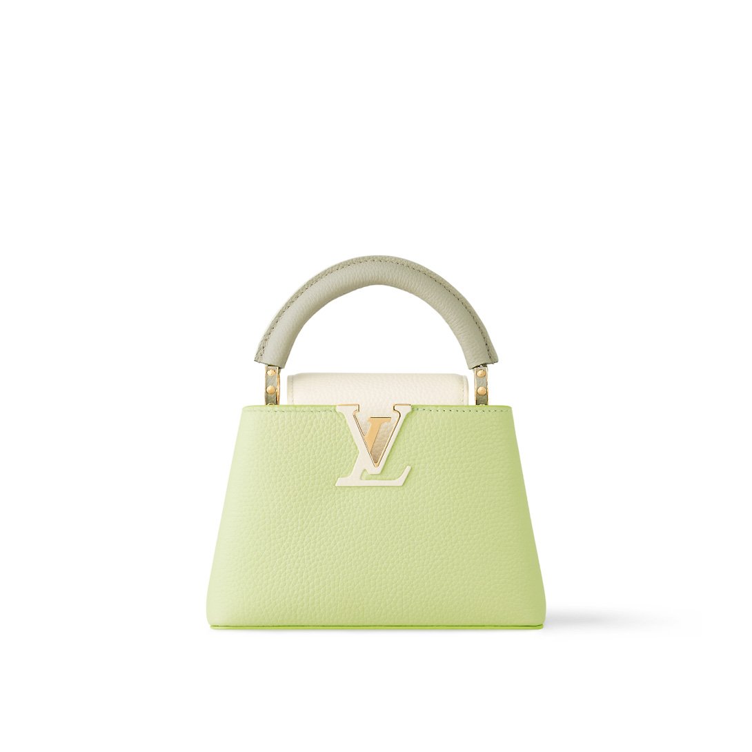 A bright color block treatment brings a joyous feel to this Capucines Mini handbag, crafted from Taurillon leather in shades of green and white. The top handle and flap in contrasted colors add a fresh feel to the classic shape. The removable braided chain strap adjusts for shoulder and cross-body carry.