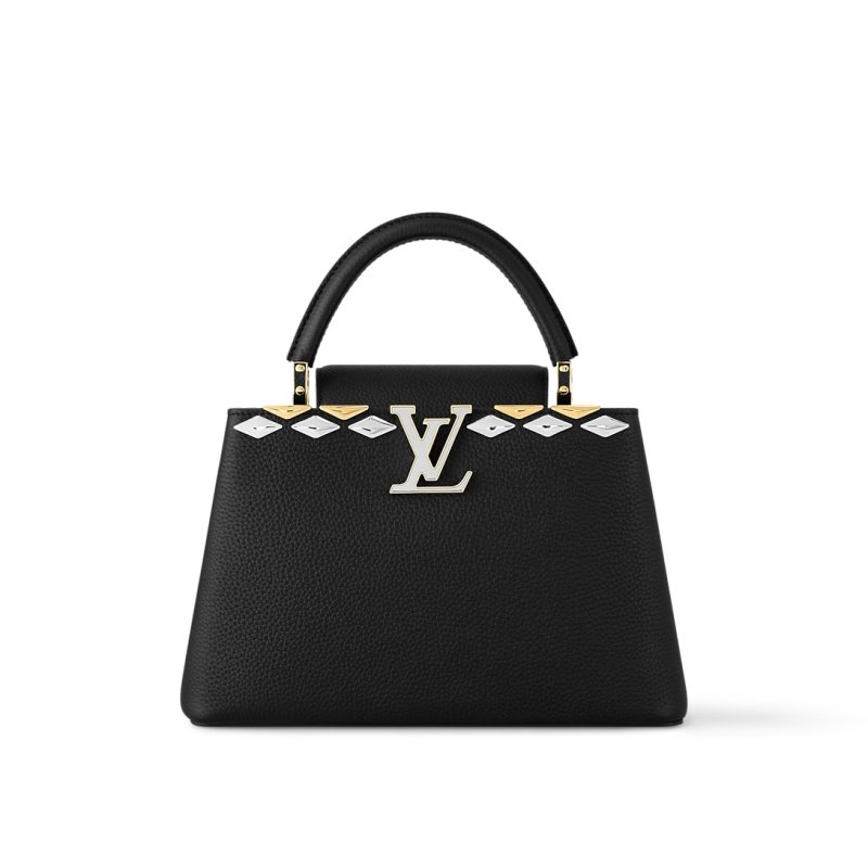 Drawing inspiration from the House’s historic trunks, this Capucines MM reinterprets the iconic Malletage signature as a refined diamond-shaped embellishment. The Malletage crown’s silver- and gold-toned hardware, is offset against a backdrop of timeless Taurillon leather. This design is fitted with numerous pockets, and has a removable strap for multiple carry options.