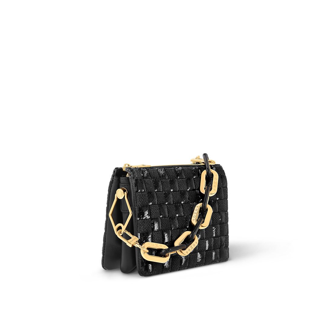 Presented at the Spring-Summer 2024 fashion show, this Coussin BB handbag displays the Maison’s iconic Damier pattern, embroidered in shimmering tonal sequins on a background of black satin. Fitted with a removable adjustable leather strap and a detachable chunky chain of engraved black-and-gold links, this sophisticated accessory can be styled in a variety of ways, for both day and evening.