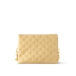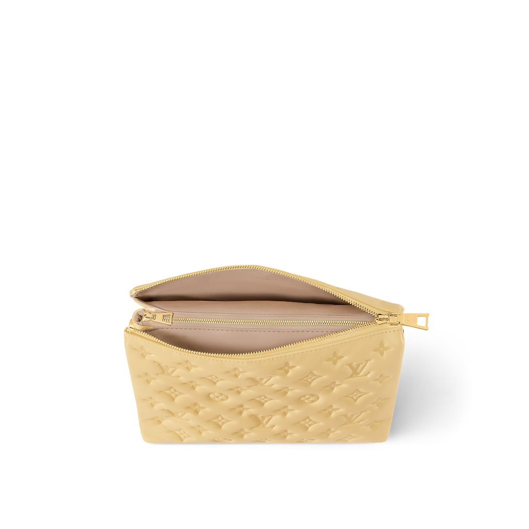 The Coussin PM is made from puffy lambskin, embossed with the Monogram, and features a chunky chain on which golden metallic links alternate with plexiglass links for a luminous touch of color. The Coussin has two inside compartments separated by an inside zipped pocket. In addition to the detachable chain, there is a wide removable strap.