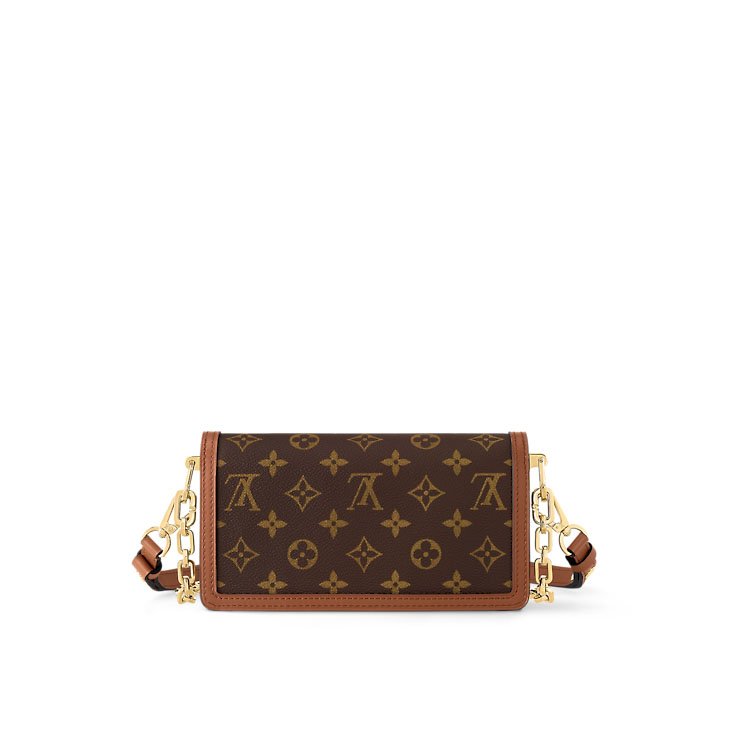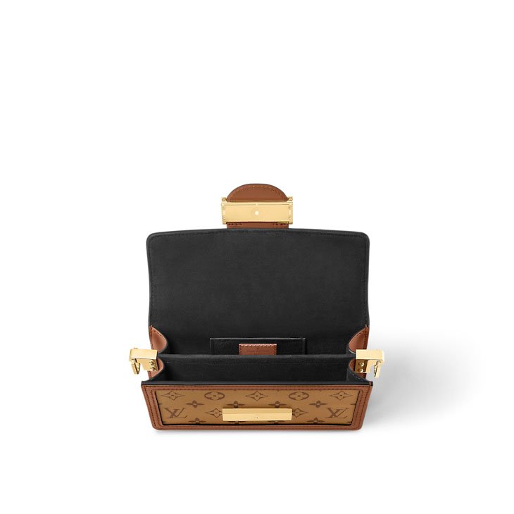 The Dauphine East-West Monogram handbag canvas sports a fashionably elongated silhouette, echoed in the Dauphine iconic rectangular LV closure. The interplay of two complementary Monogram canvases – classic and Reverse – lends this piece a signature appeal. The leather shoulder strap and the golden chain are both removable, offering a variety of styling options.