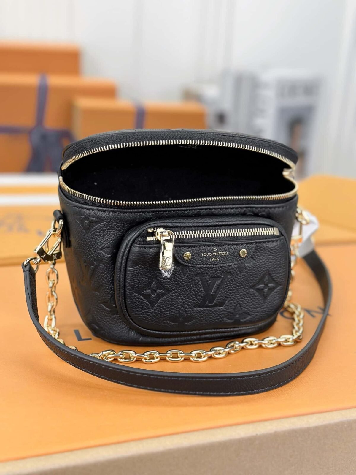 The Mini Bumbag is reinterpreted in supple, grained Monogram Empreinte leather, which is embossed with the Monogram pattern. This on-trend piece features a removable, adjustable strap and a removable, gold-tone chain for different looks and carry options. It has a zipped main compartment and a zipped front pocket with an embossed leather tag.