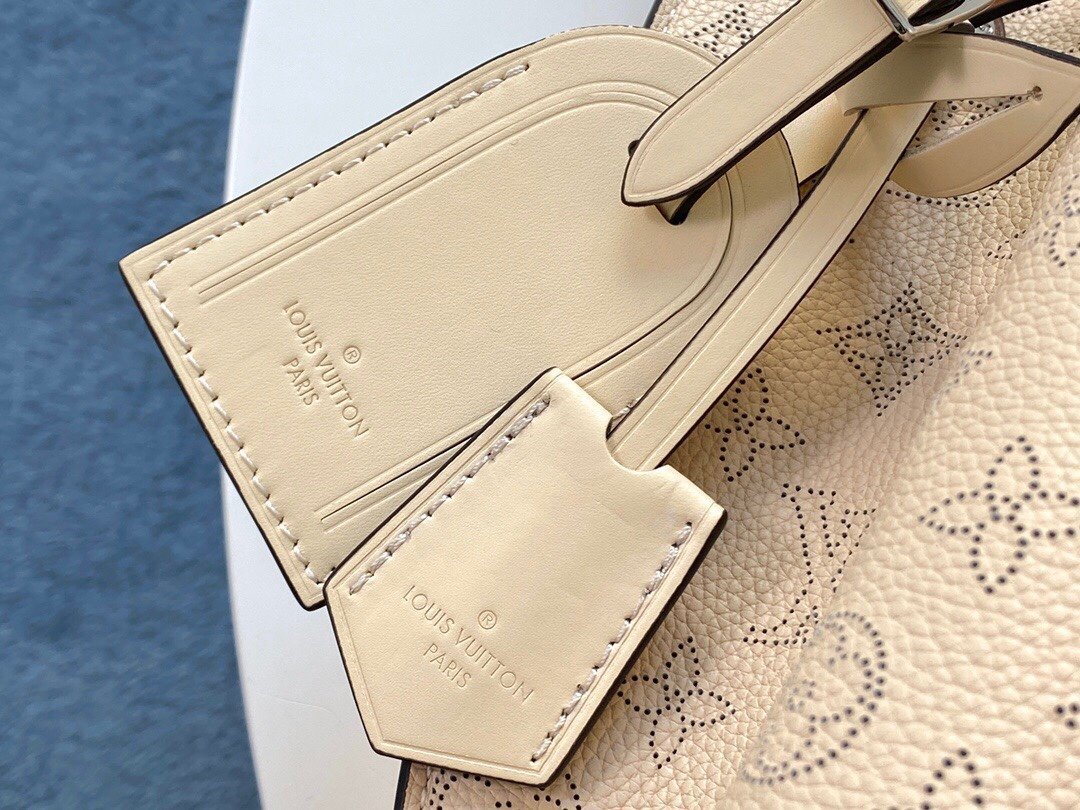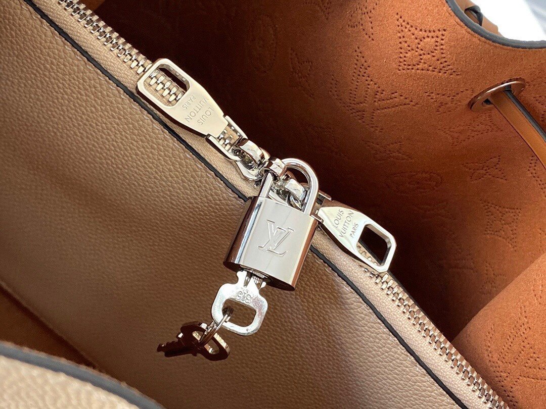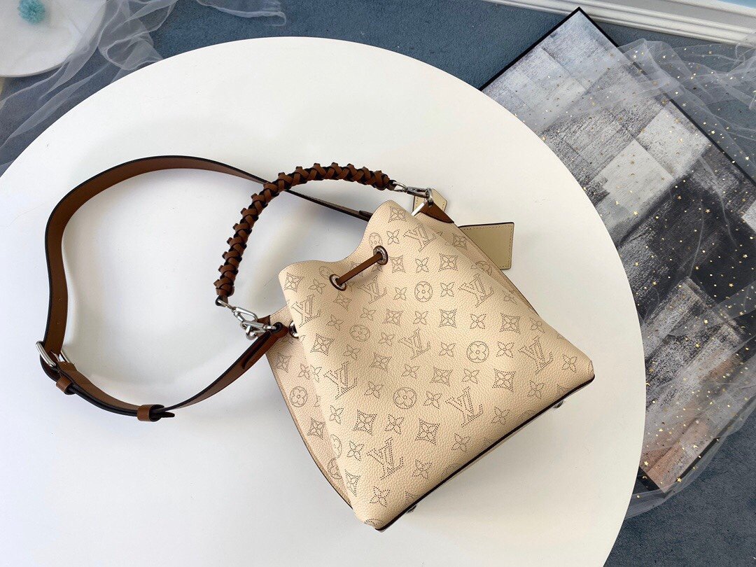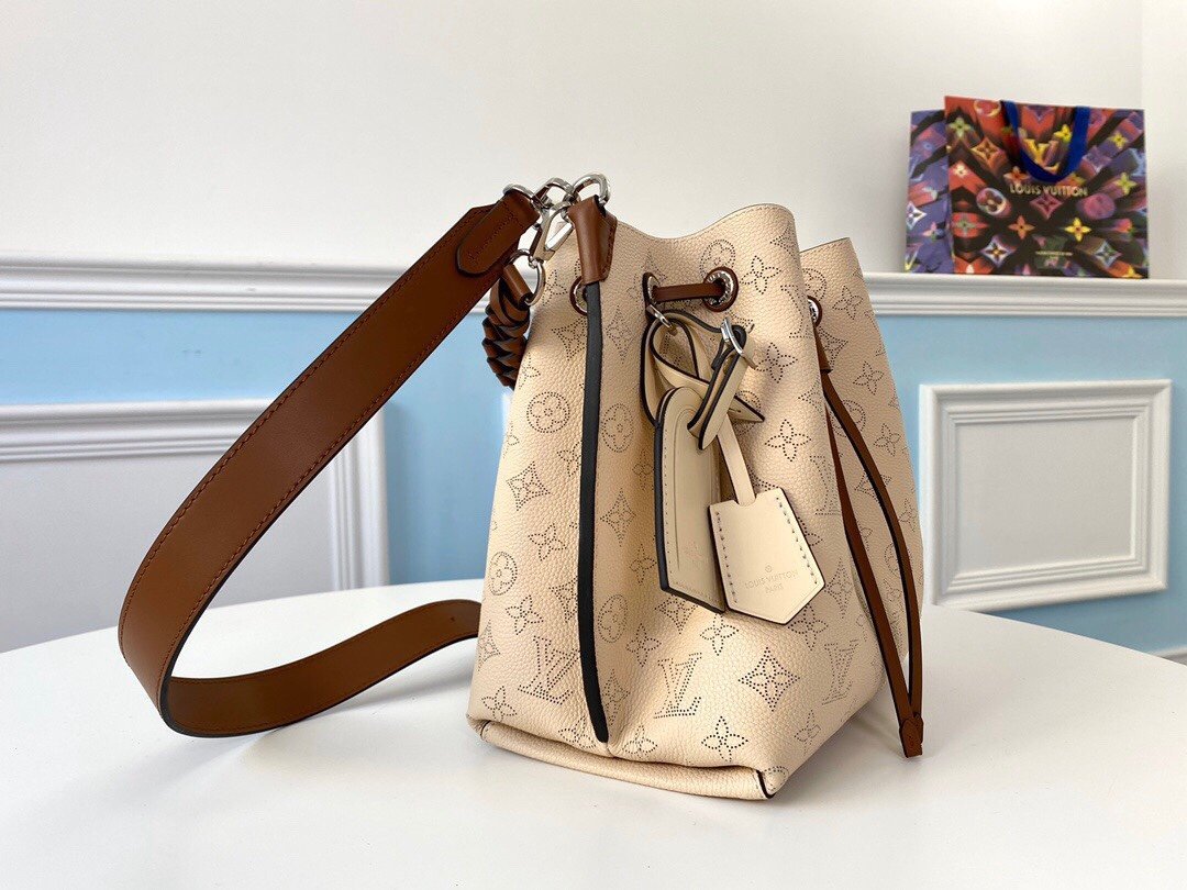 The Muria bucket bag is made from Mahina calf, a perforated leather with a discreet Monogram motif. Supple and sophisticated, it is a pleasure to carry, either by the braided top handle or the long leather strap, which adjusts for short- and long-shoulder or hands-free cross-body wear. Crafted signature details include a name tag and keybell in smooth calfskin.