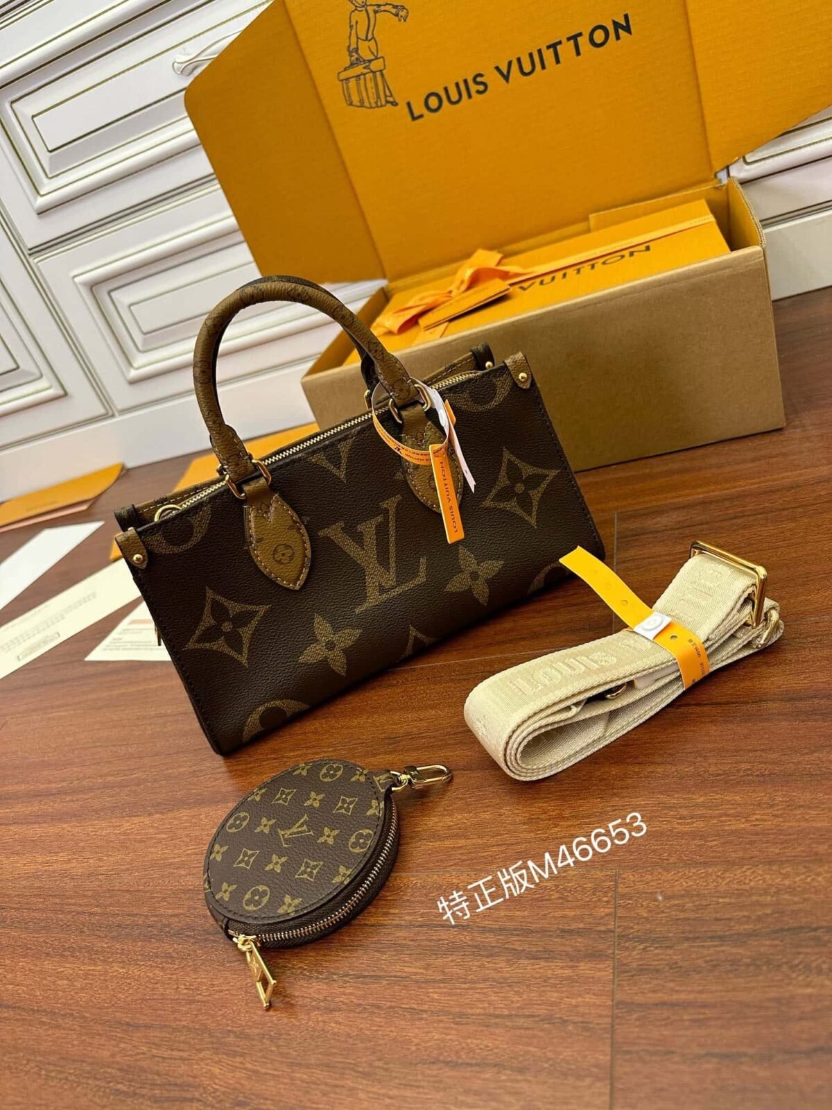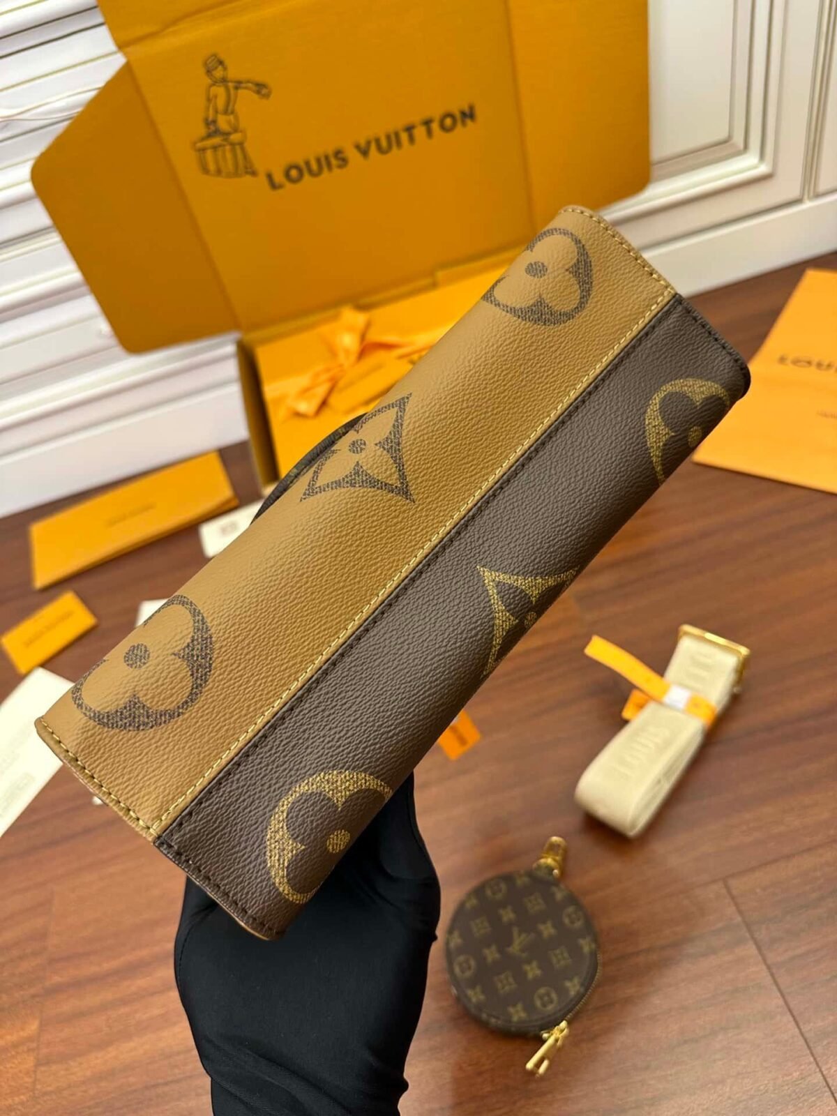 The Maison reinterprets the OnTheGo tote this season with a new east-west shape and a modern mix of Giant Monogram and Monogram Reverse canvas. Fitted with two Toron top handles and a wide, detachable strap, this beautifully proportioned bag can be styled in a variety of ways. A removable round coin purse completes this versatile design.