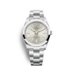 The Oyster bracelet is a perfect alchemy of form and function, aesthetics and technology. First introduced in the late 1930s, this particularly robust and comfortable metal bracelet with its broad, flat three-piece links remains the most universal bracelet in the Oyster collection. For the Oyster Perpetual models the Oyster bracelet is fitted with an Oysterclasp.