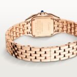 Panthere Small Rose Gold Diamond Ladies Watch WJPN0008 Box Papers. Quartz movement. 18k rose gold case 22.0 x 22.0 mm (28.0 including the lugs). Octagonal crown set with the diamond. 18k rose gold polished bezel with original factory diamonds, secured with 8 pins. Scratch resistant sapphire crystal. Silvered dial with black roman numerals. Sword shaped blue hands. Secret signature at X. 18k rose gold bracelet with hidden deployant clasp. Fits 6 1/4″ wrist. Mint condition