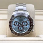 The ice-blue dial is the discreet and exclusive signature of a Rolex platinum watch. Rolex uses platinum, the noblest of metals, for the finest of watches.