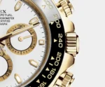 THIS OYSTER PERPETUAL COSMOGRAPH DAYTONA IN 18 CT YELLOW GOLD WITH A WHITE DIAL AND AN OYSTERFLEX BRACELET, FEATURES A BLACK CERACHROM BEZEL WITH TACHYMETRIC SCALE.