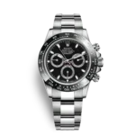 THIS OYSTER PERPETUAL COSMOGRAPH DAYTONA IN OYSTERSTEEL WITH A BLACK DIAL AND AN OYSTER BRACELET, FEATURES A BLACK CERACHROM BEZEL WITH TACHYMETRIC SCALE.