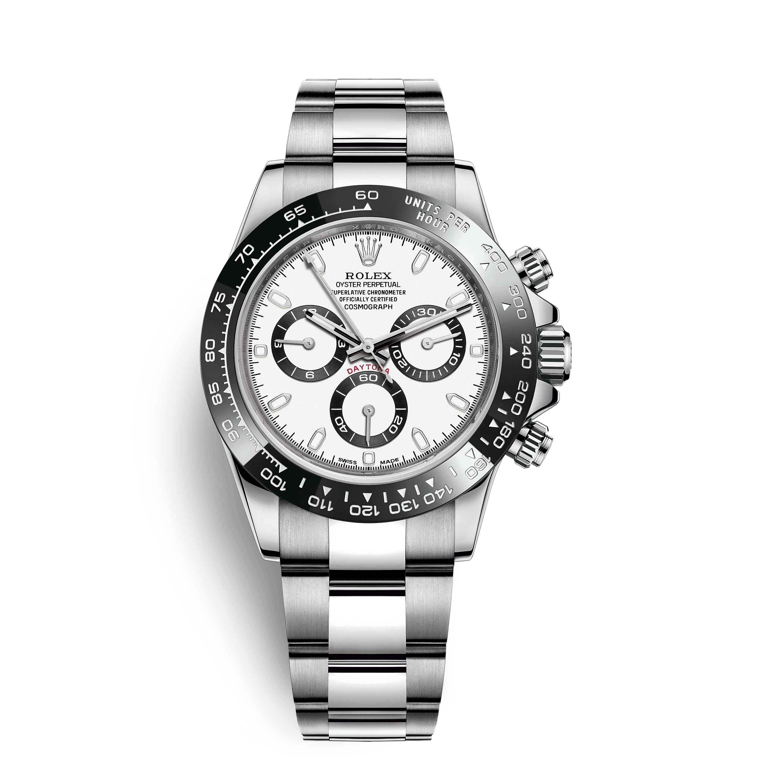 THIS OYSTER PERPETUAL COSMOGRAPH DAYTONA IN OYSTERSTEEL WITH A BLACK DIAL AND AN OYSTER BRACELET, FEATURES A BLACK CERACHROM BEZEL WITH TACHYMETRIC SCALE.
