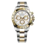 THIS OYSTER PERPETUAL COSMOGRAPH DAYTONA IN OYSTERSTEEL AND YELLOW GOLD, WITH A WHITE DIAL AND AN OYSTER BRACELET, FEATURES A YELLOW GOLD BEZEL WITH ENGRAVED TACHYMETRIC SCALE.