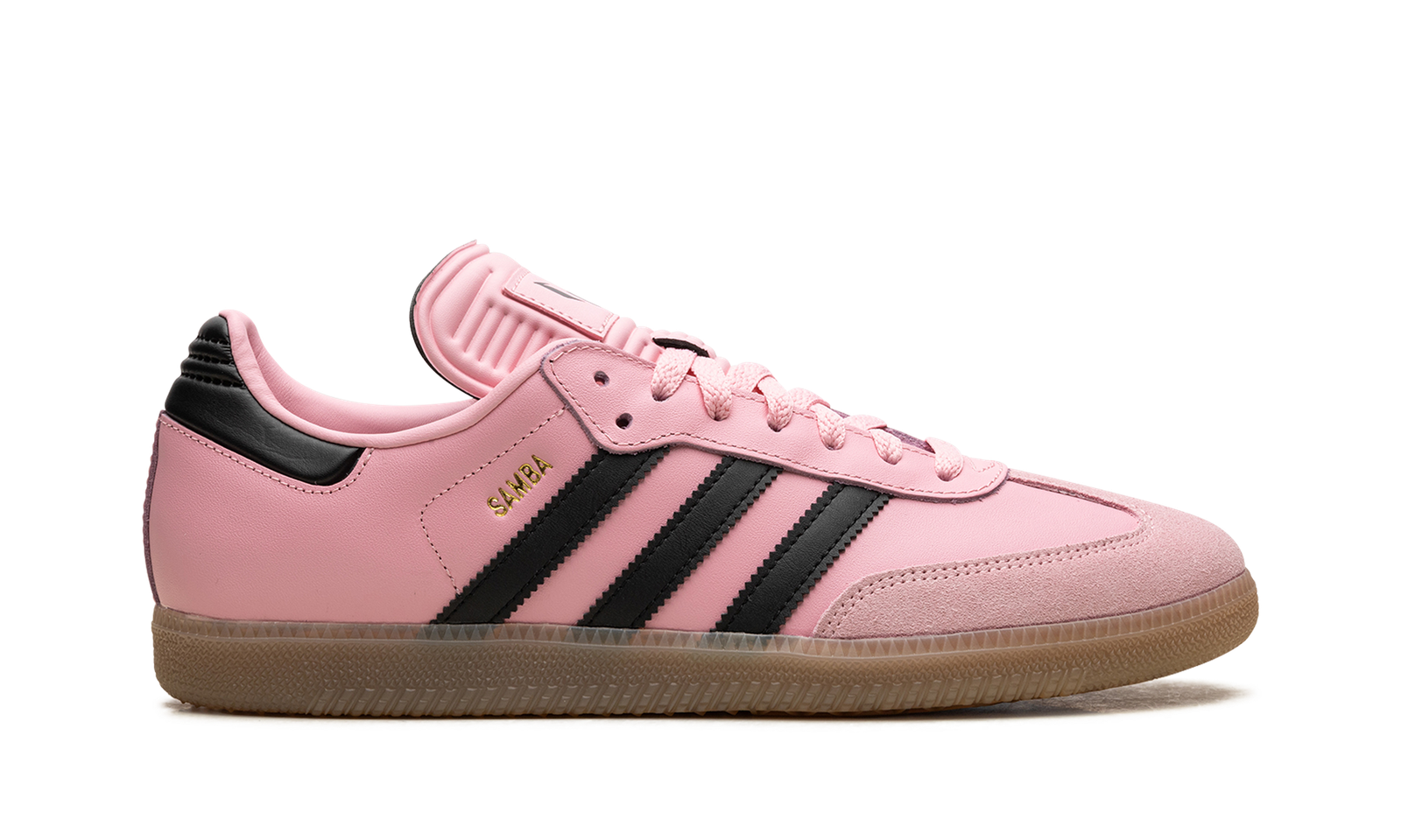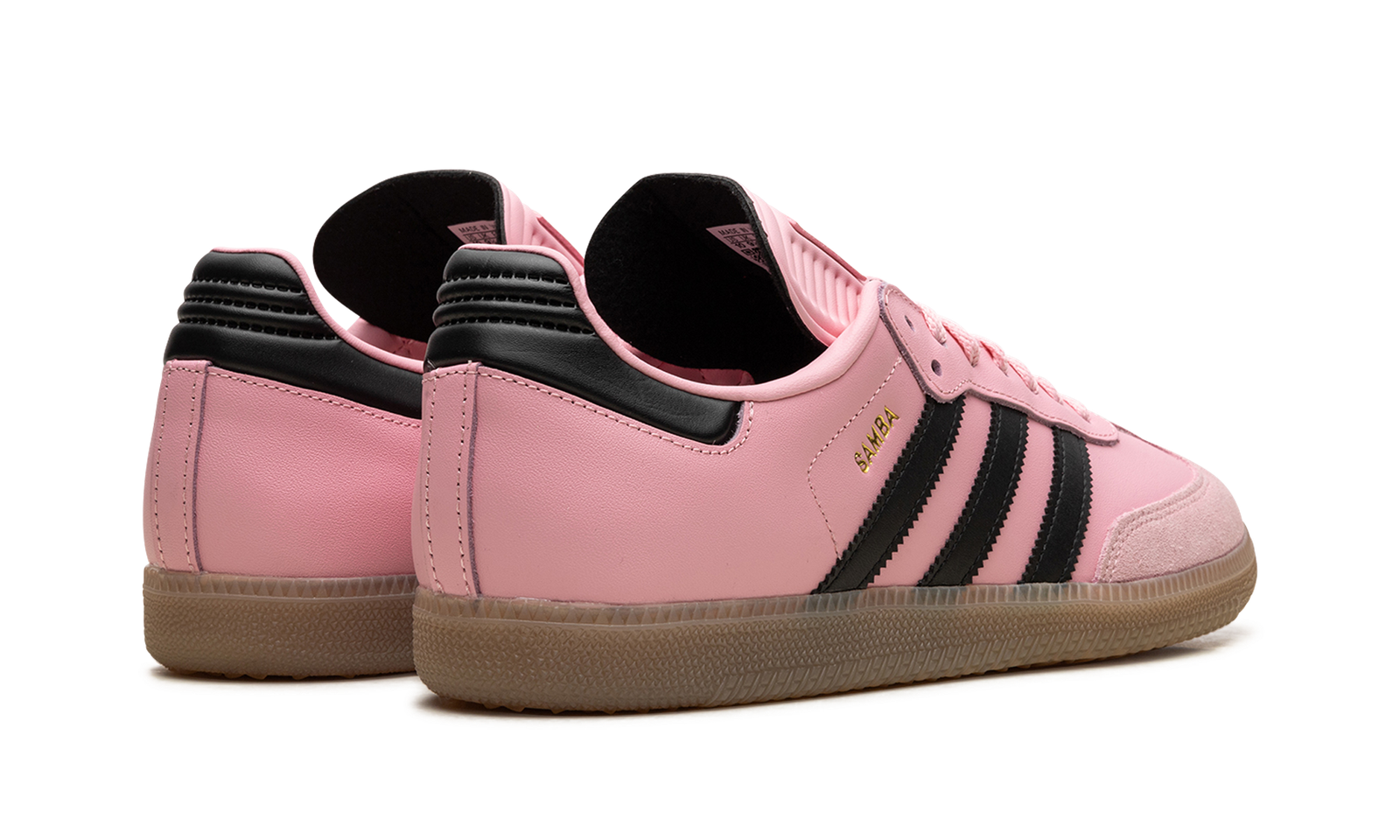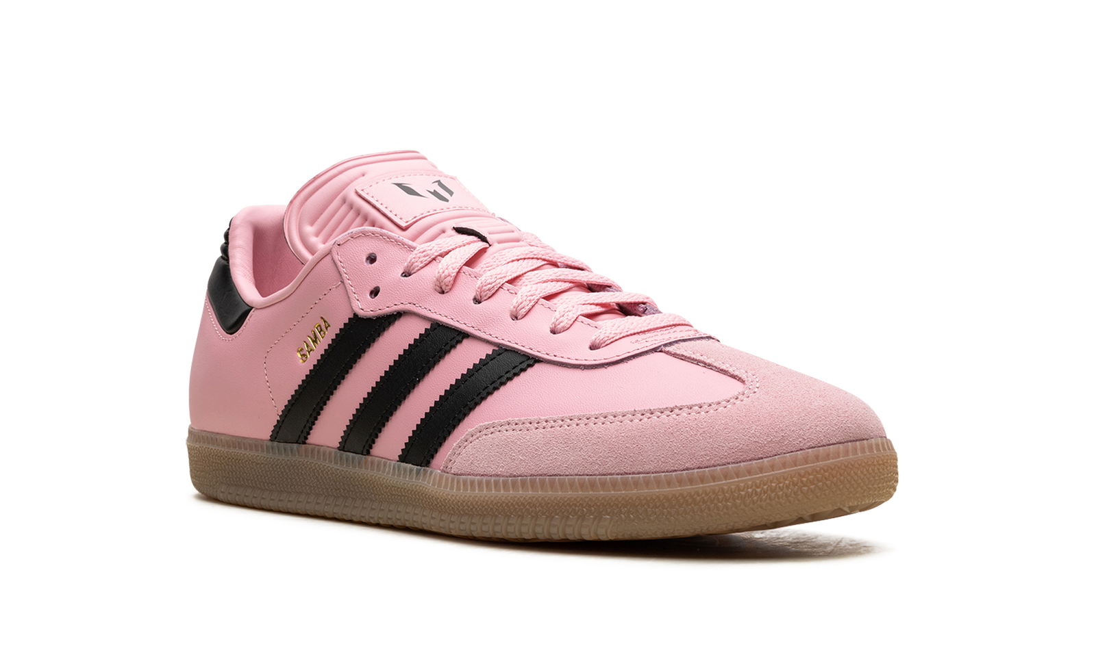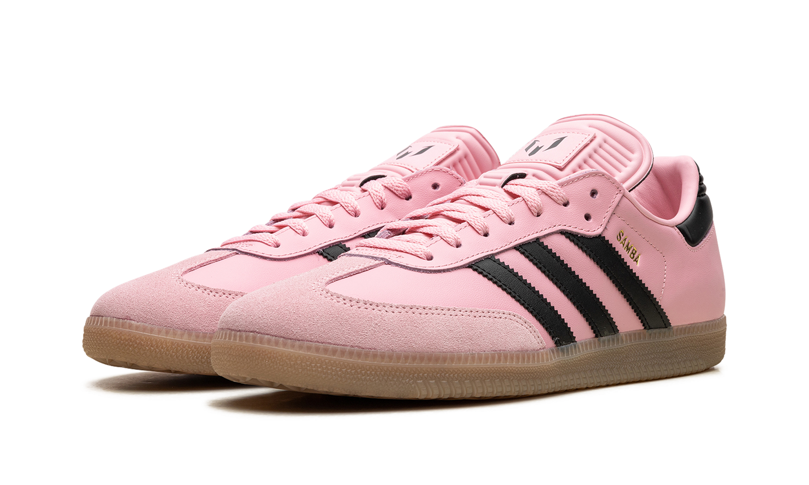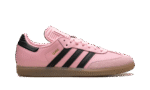 The adidas Samba OG “Inter Miami – Messi Pink” is a colorway of the popular sneaker inspired by the Major League Soccer team and its star player, Lionel Messi. The “Inter Miami – Messi Pink” features the colors of the Miami-based team on its design. The upper has a Pink leather construction with Black leather Three Stripes branding. A gold “Samba” logo appears on the lateral side of the mid-panel, while detailing inspired by Inter Miami is located on the tongue. A semi-translucent, smoky Gum rubber sole completes the look.