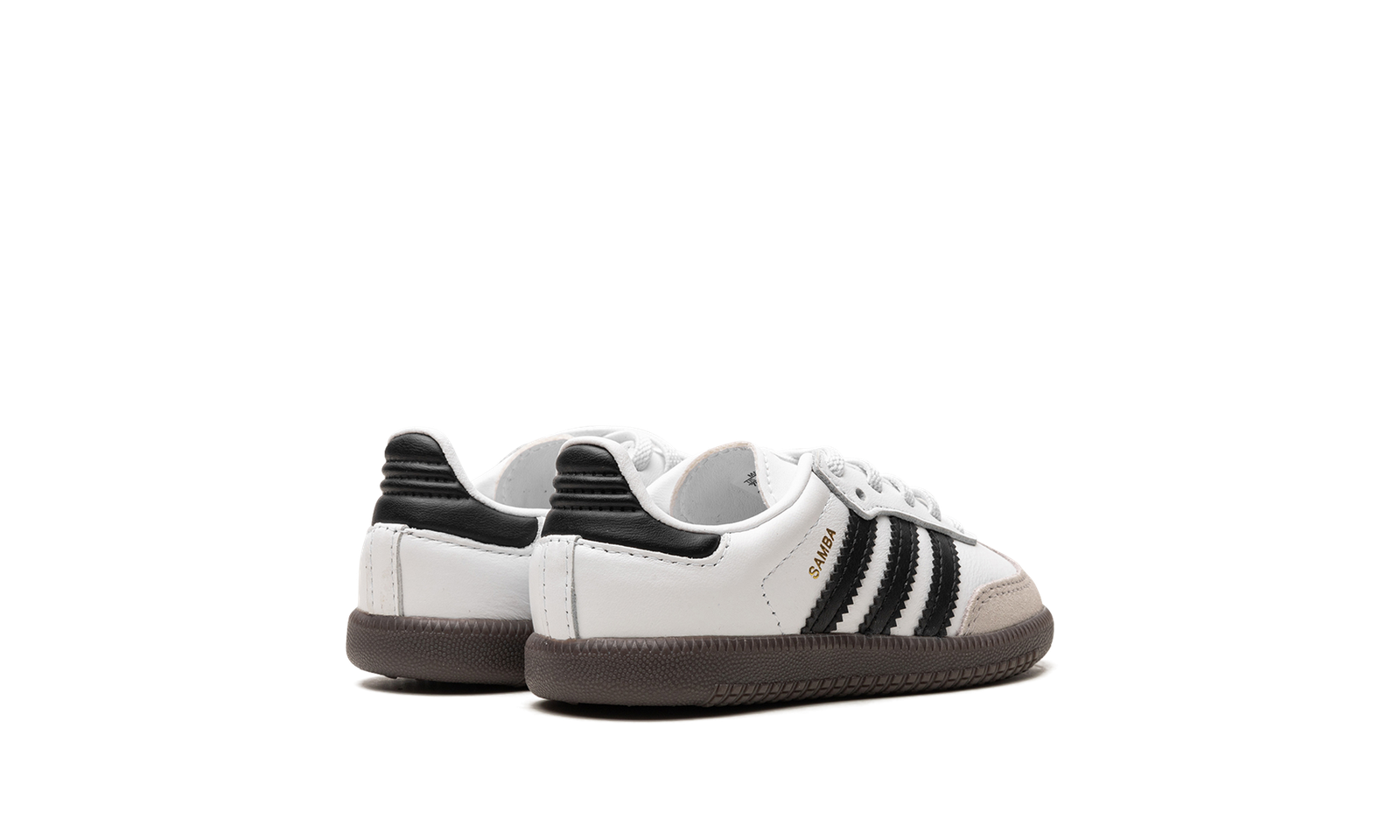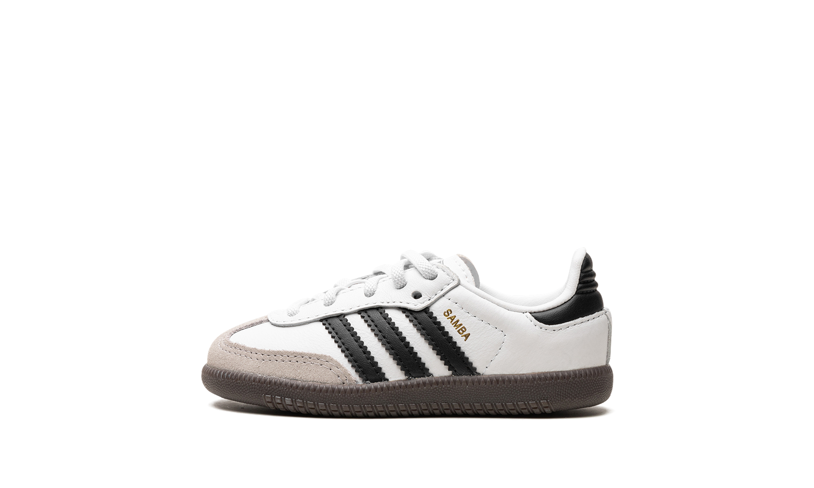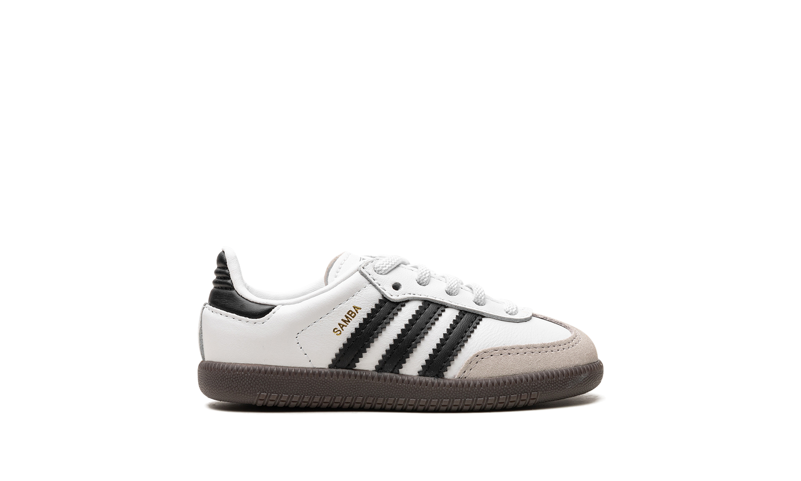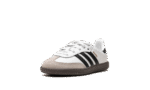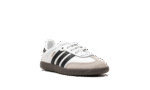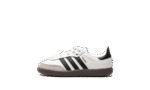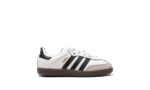 The adidas Samba OG TD “White/Black/Gum” is the toddler sizing of the classic colorway of the retro indoor soccer shoe. The adidas Samba has enjoyed a resurgence in popularity in recent years, as the shoe’s classic design has come to be appreciated by more and more people looking for a casual shoe that can be worn with anything. As for the design of the Samba’s “White/Black/Gum” colorway for toddlers, it features a white leather construction with tan suede overlays on the toe and forefoot. Black Three Stripes branding is found on the sides. “Samba” detailing appears in gold foil lettering on the lateral side of the shoe and an “adidas Samba” patch can be found on the tongue. A gum rubber sole completes the look.