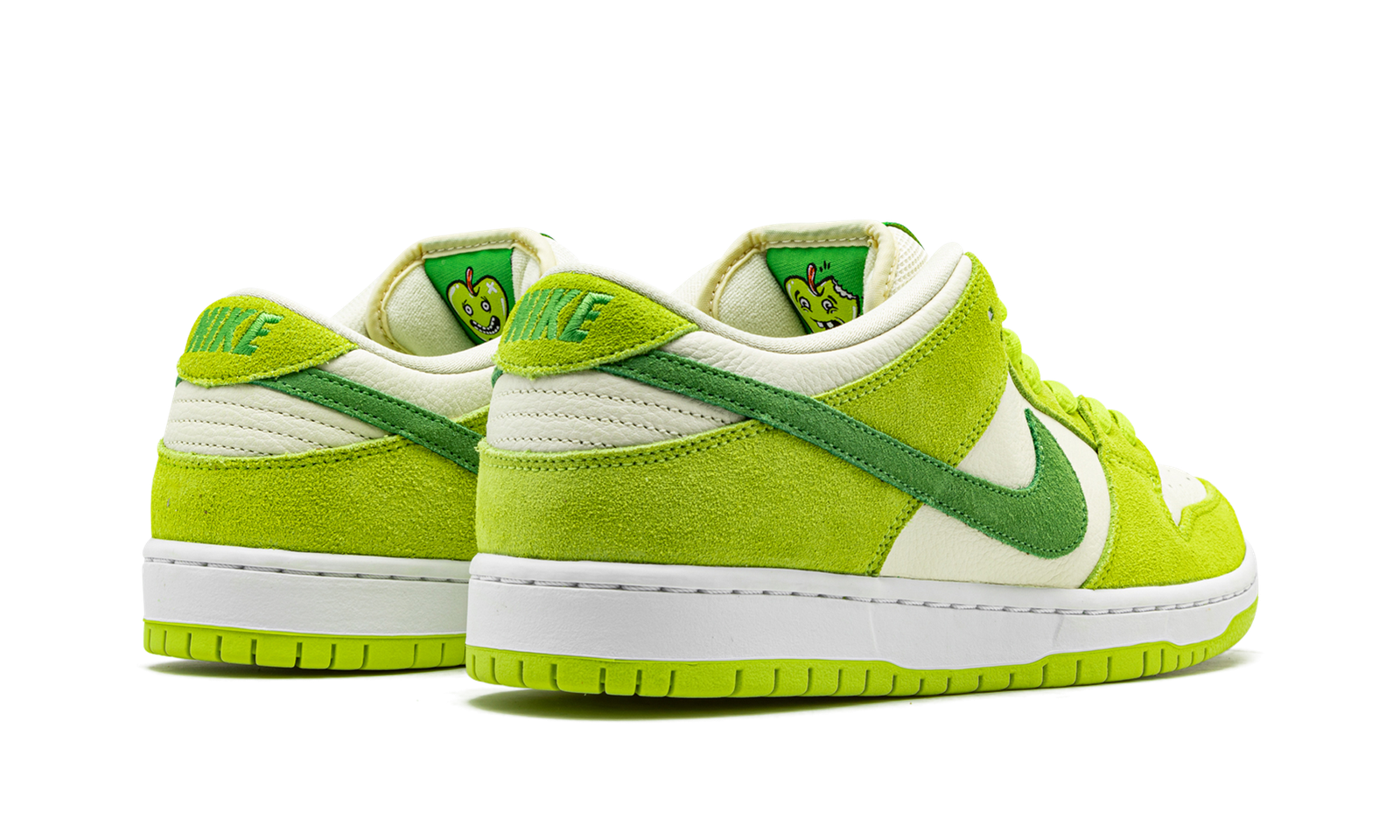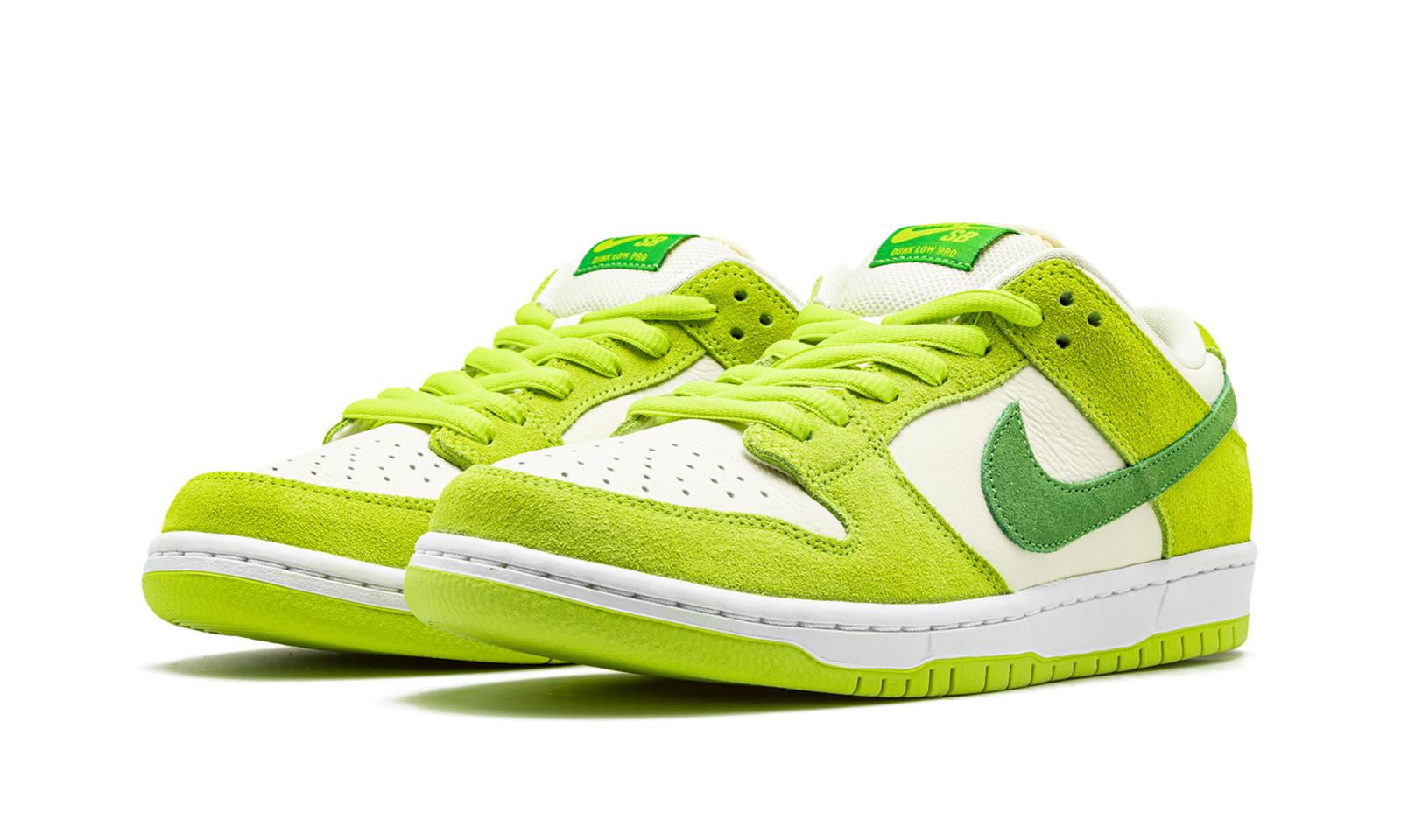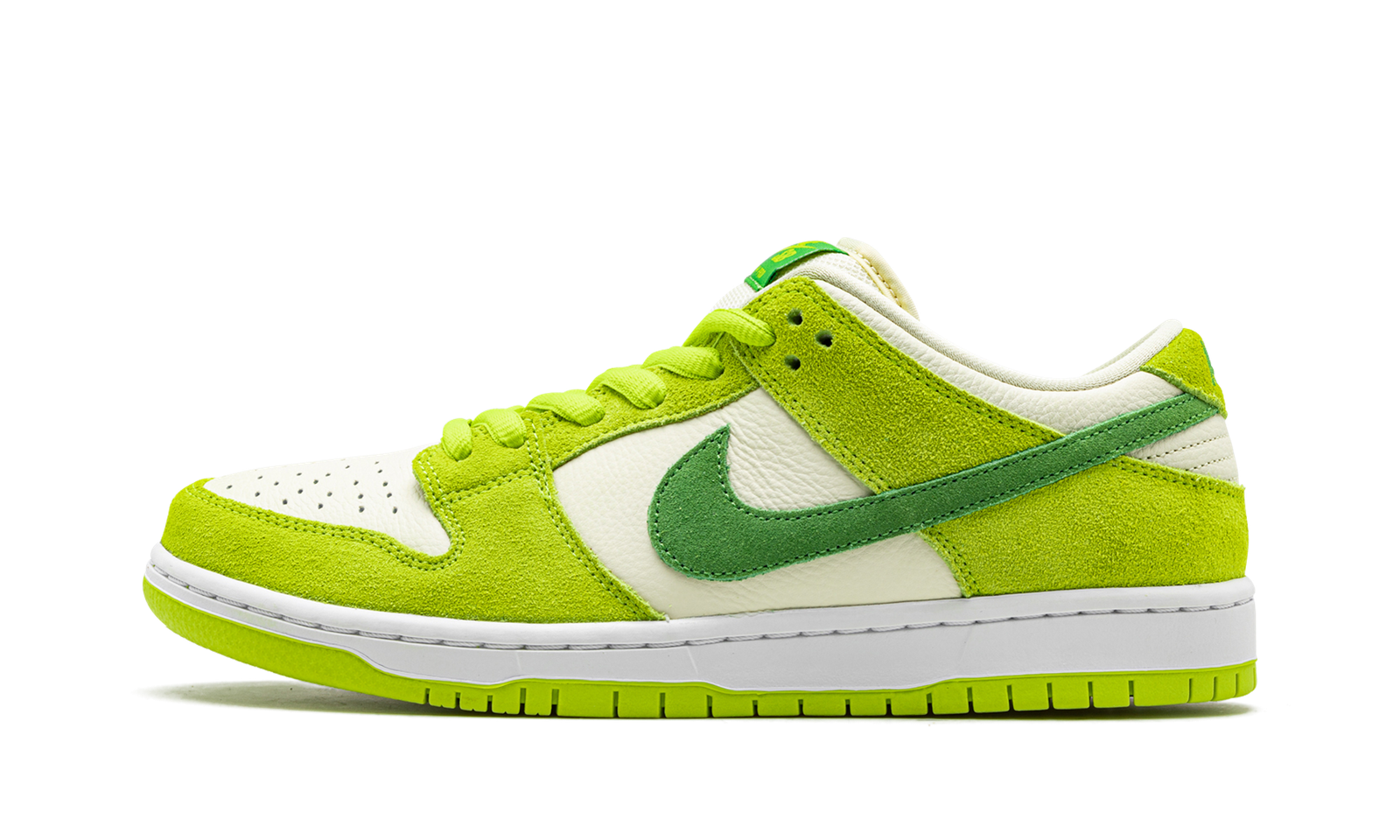 The Nike SB Dunk Low “Green Apple” is a fun colorway from the “Fruit Pack” released by the skate brand in June 2022. The summer-inspired design features cream-colored leather on the perforated toe, mid-panel, collar, and heel. Contrasting Green Apple suede overlays and Swoosh branding attract attention. Classic “Nike” branding is embroidered on the heel and “Nike SB Dunk” insignia is found on the green nylon tongue tag on the puffy cream mesh tongue. A drop-in Zoom Air unit in the heel of the midsole provides a comfortable ride and impact absorption while skating.