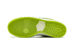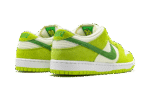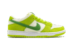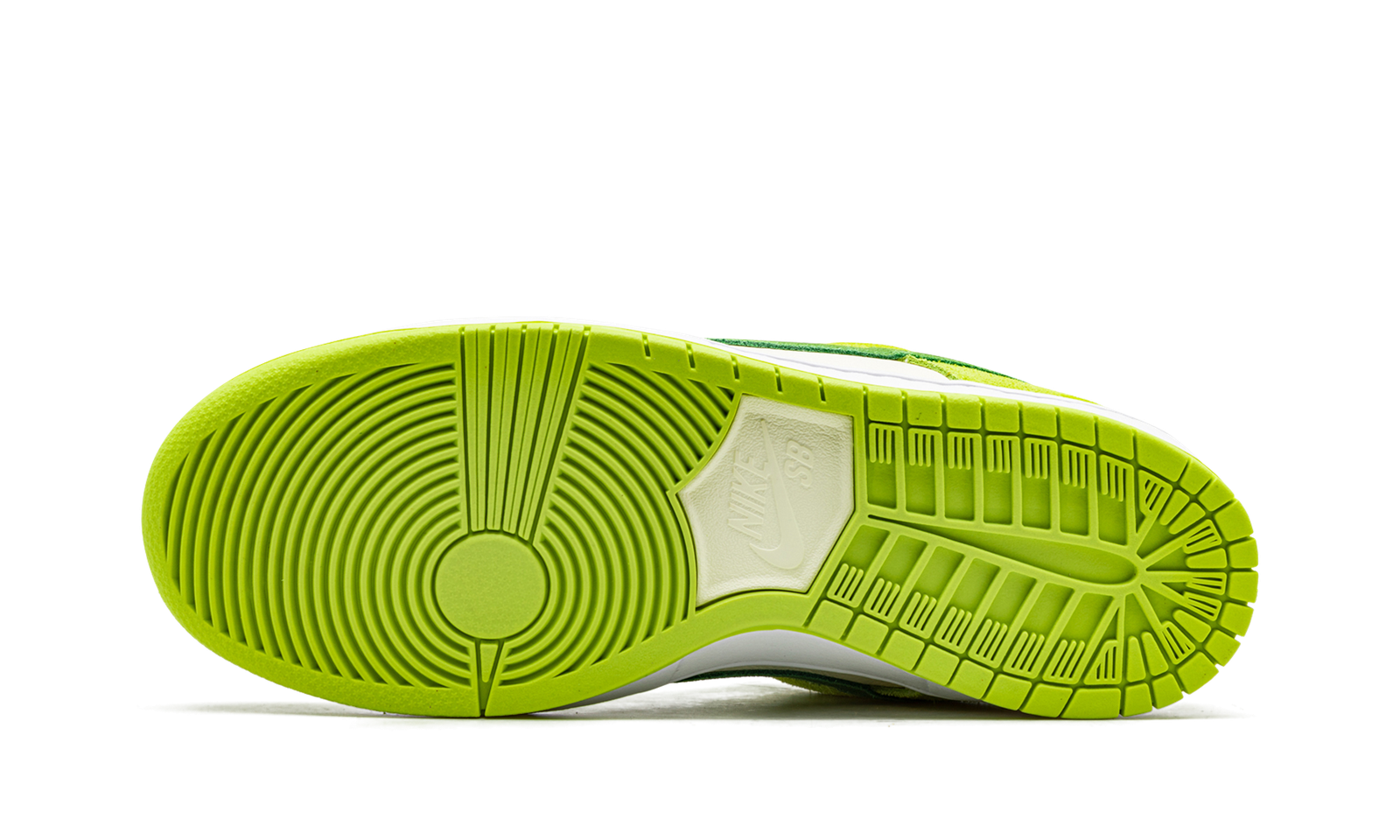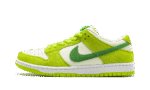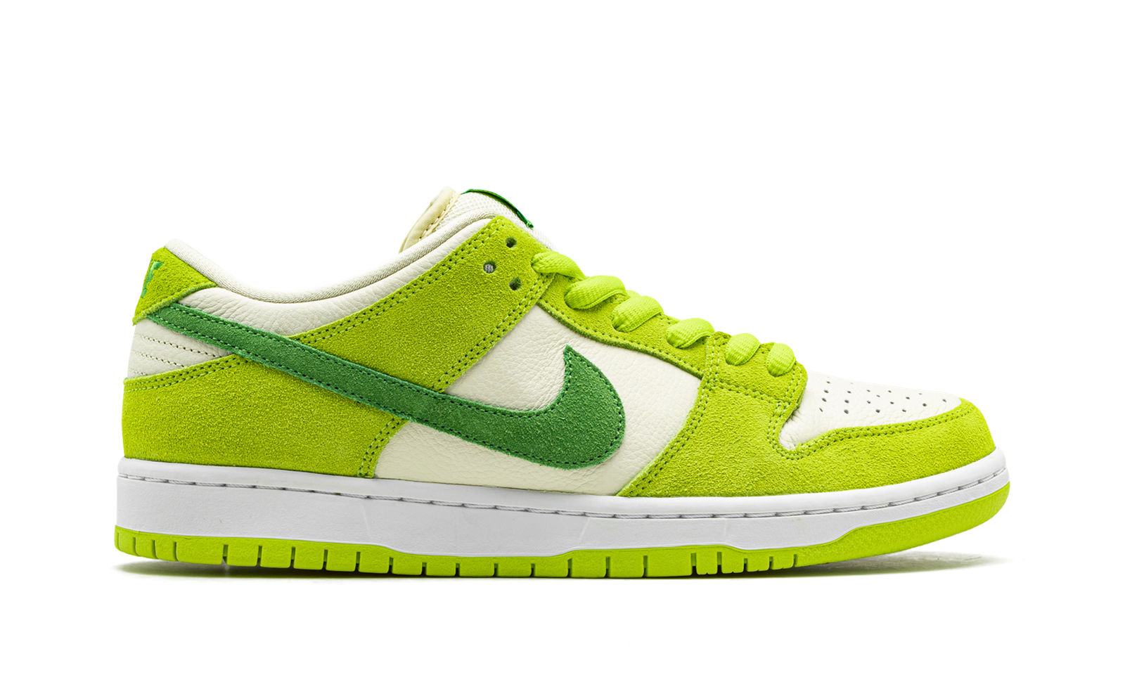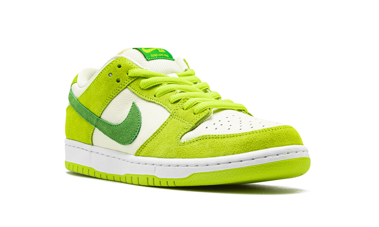 The Nike SB Dunk Low “Green Apple” is a fun colorway from the “Fruit Pack” released by the skate brand in June 2022. The summer-inspired design features cream-colored leather on the perforated toe, mid-panel, collar, and heel. Contrasting Green Apple suede overlays and Swoosh branding attract attention. Classic “Nike” branding is embroidered on the heel and “Nike SB Dunk” insignia is found on the green nylon tongue tag on the puffy cream mesh tongue. A drop-in Zoom Air unit in the heel of the midsole provides a comfortable ride and impact absorption while skating.