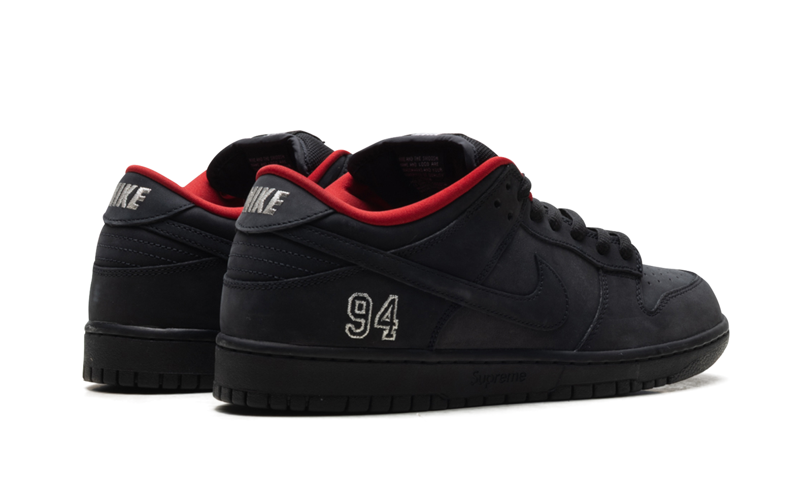 The Supreme x Nike SB Dunk Low “Black” is one of five colorways that the streetwear brand released in spring 2025. Anytime Supreme releases a Dunk, it’s a big deal, and this 2025 collaboration is no exception. The “Black” colorway of the Supreme Dunk features a tonal black suede upper that is accented with a bright pop of red around the heel collar. The number “94” is embroidered by the heel in a style that is reminiscent of Michael Jordan’s “23” that appears on certain Air Jordan 5 models. The “94” is a nod to the year Supreme opened, and the brand’s logo is also debossed on the midsole.