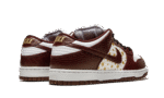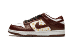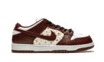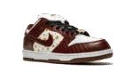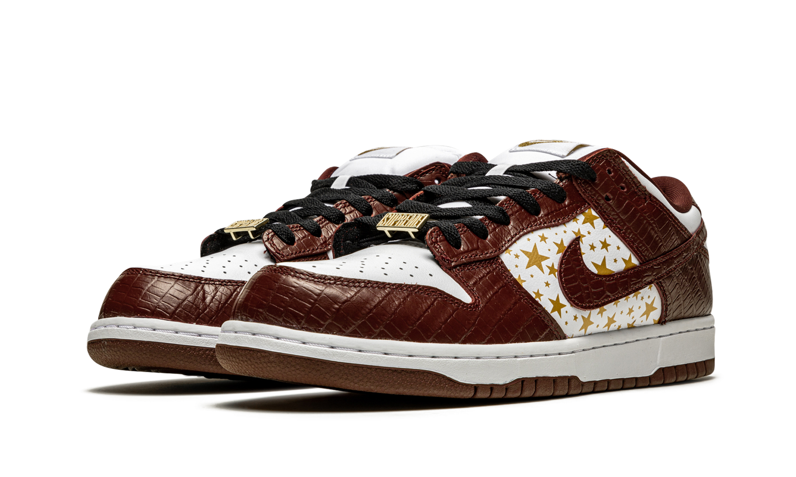 The Supreme x Nike SB Dunk Low “Stars – Barkroot Brown” is a collaboration between the New York City based streetwear brand and Nike SB that puts a premium spin on the popular skate shoe. One of four colorways released in March 2021, the “Stars – Barkroot Brown” mimics the unique styling of Supreme and Nike SB’s second-ever collaboration from 2003. Like the “OG” collection, the modern release features faux crocodile-texture leather panels on the forefoot, eyelets, collar, heel, and Swoosh. A crisp white base on the perforated toe and on the mid-panel and collar allows the for the croc-textured panels to attract attention. Additionally, the metallic gold “stars” motif printed on either side of the shoe is reminiscent of the look of the original “Stars” colorway designed by Supreme. A metallic gold Supreme emblem sits on the black laces of the white mesh tongue and a gold embroidered Nike logo is stitched onto the back of the shoe. Release date: March 4, 2021.
