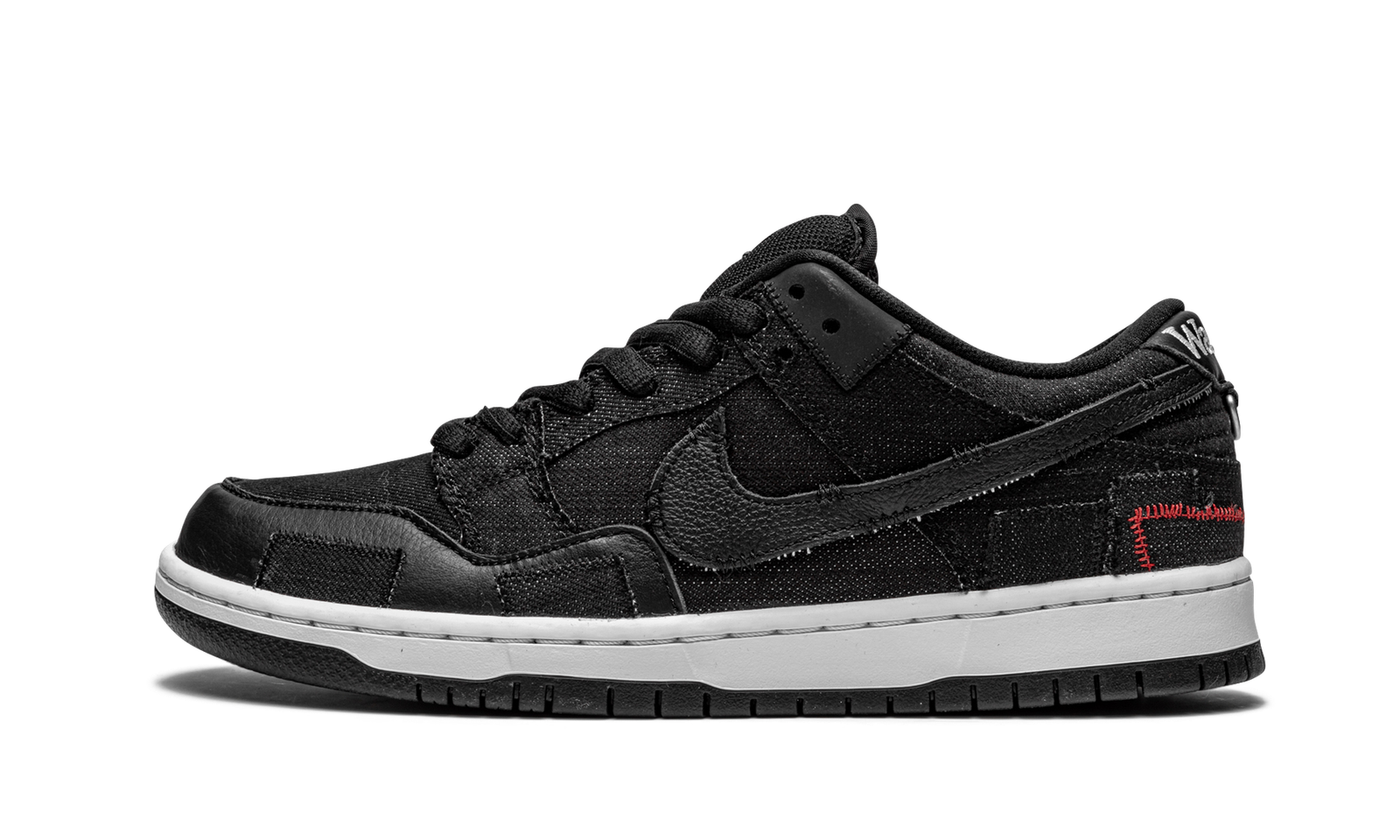 The Wasted Youth x Nike SB Dunk Low is a punk inspired collaboration between streetwear designer Verdy and Nike SB on the low-top skate shoe. Wasted Youth, which precedes the Japanese designer’s Girls Don’t Cry streetwear imprint, was revived for this limited edition colorway of the SB Dunk Low and, true to its nickname, the look is wholly influenced by the rebellious spirit of punk rock. The upper’s washed black denim base features a decidedly pre-worn look with fraying and unfinished edges on each panel. A frayed black tumbled leather Swoosh logo appears on the lateral side and an embroidered red rose motif is incorporated into the design of the Swoosh branding on the medial side. Red contrast stitching can be found on the back of the shoe beneath the silver metallic hoops that are hooked into the leather branding patch on the heel. The slogans “Wasted” and Youth” are embroidered on the back of the left and right shoe, respectively. Verdy and Nike SB add a patchwork-like leather and denim overlay to the forefoot of each shoe. Mismatching white and black Nike SB branding can be found on the right and left tongue tags, as well. Zoom Air cushioning is embedded within the midsole for all-day comfort. Release date: April 6, 2021.