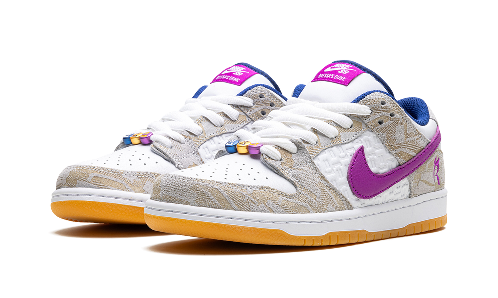 The Rayssa Leal x Nike SB Dunk Low is a collaboration by the Brazilian skateboarding sensation and Nike SB on the retro skate shoe. At 15 years-old, Leal won a silver medal at the 2020 Olympics in Tokyo, etching her name in the annals of skateboarding. As for her SB Dunk, the shoe features a white leather perforated toe with tan textile overlays and mismatched Vivid Purple and Deep Royal Blue leather Swooshes on opposite sides. Leal’s “R” brand is found on the lateral side of the heel, while blue “Nike” branding is embroidered on the heel. Smiley face charms appear on the lace dubrae. Classic “Nike SB Dunk” detailing can be found on the tongue tag. Underfoot, a white midsole and gum rubber outsole complete the look. Release date: Spring 2024