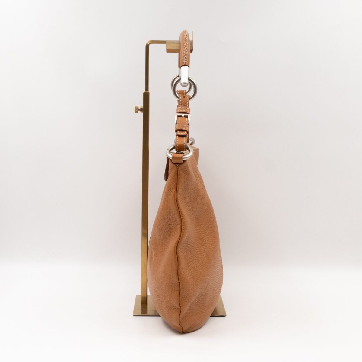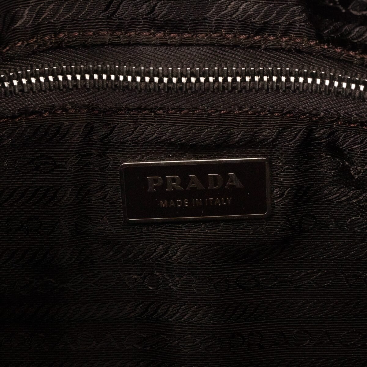 This is a pretty Prada shoulder bag. Very convenient shoulder bag in a brown leather, combined with silver-tone hardware. Top zipper open to a zipper pocket. Great choice for daily use.