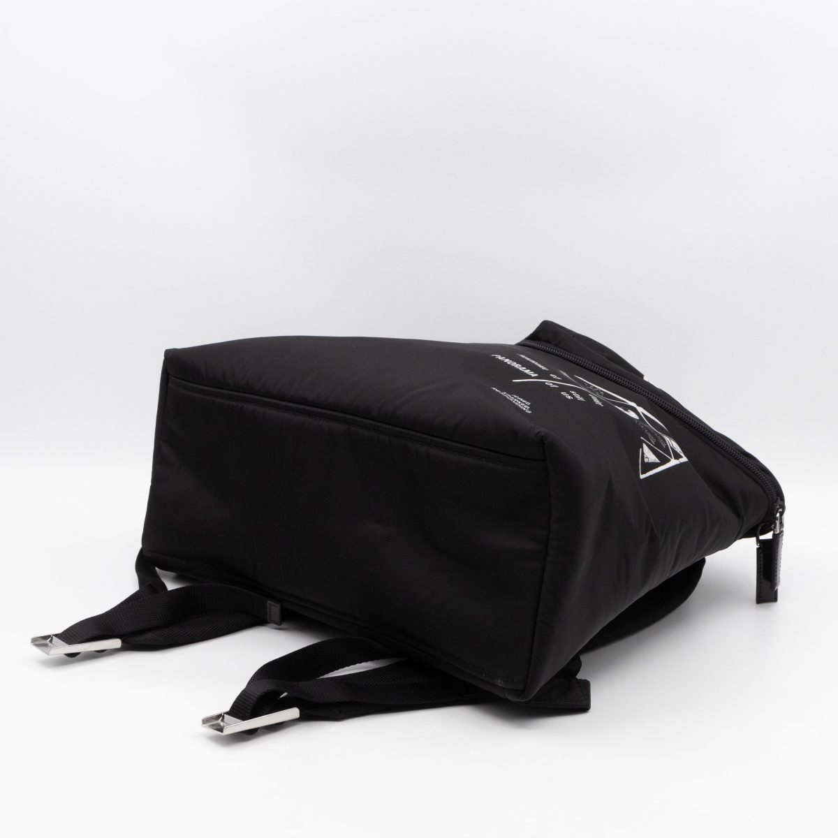 Iconic black nylon backpack in the spring/summer 2021 collection from Prada. Made in black nylon with black leather trims and silver-tone hardware. They are born by the collaboration between the iconic Italian brand and Peter de Potter, a famous Belgian artist. The quilted straps are foam-backed for a comfortable carry. The backpack features a zipper closure, a front flap with the iconic triangle logo and two internal pockets, one with zipper. Comfortable and very practical, great choice for daily use. Retail price is around €1600.