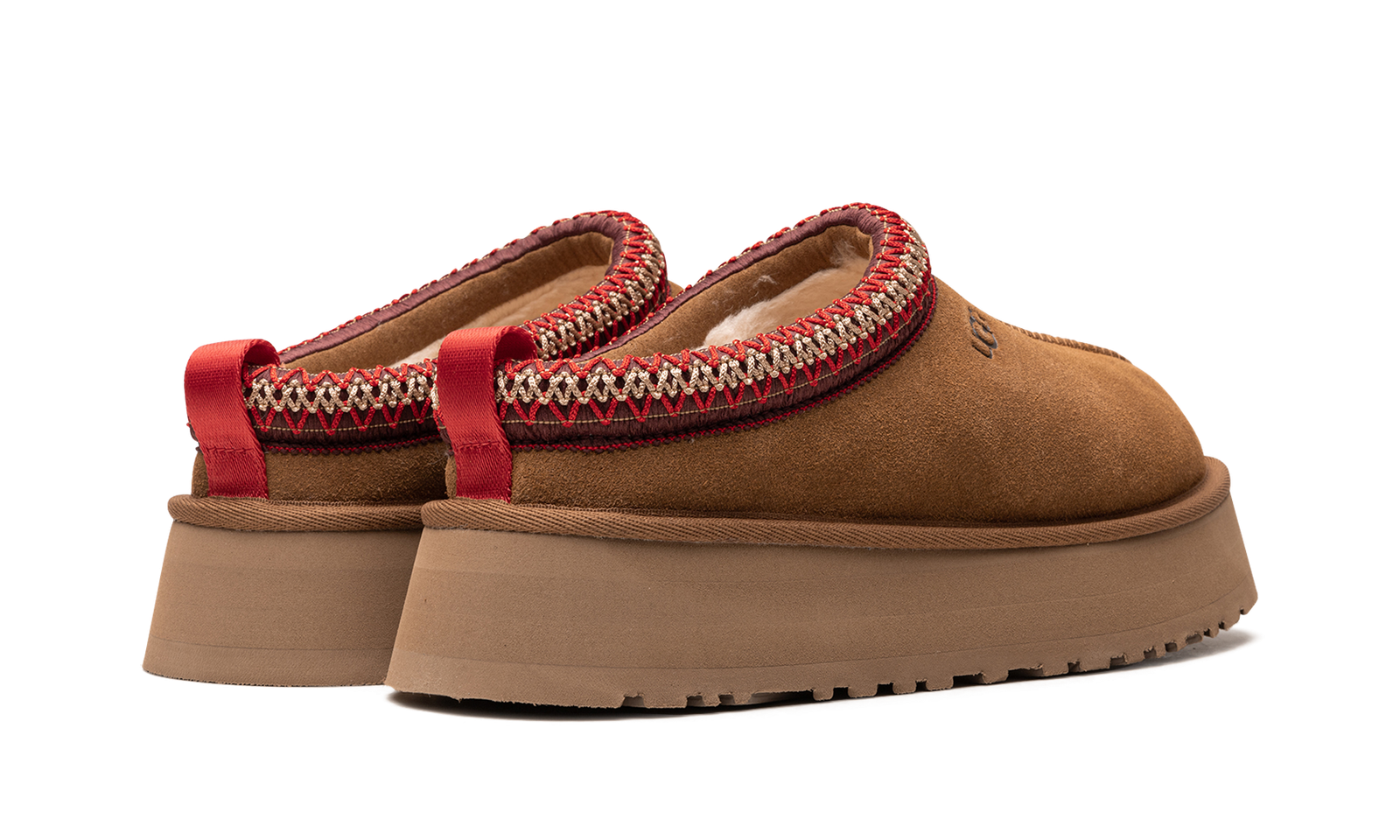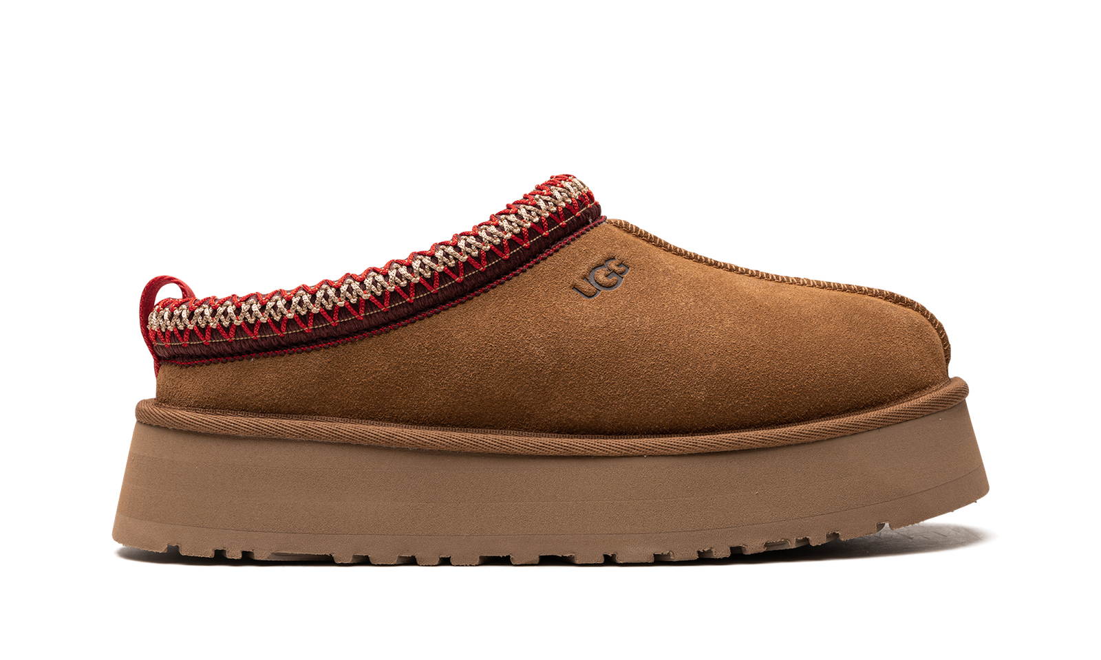 Elevate your cozy style with the popular UGG Tazz WMNS “Chestnut” platform slipper. This women’s favorite features a rich suede upper and a warm inner lining of plush sheepskin and upcycled wool for supreme comfort. The fashionable platform sole gives you a subtle boost in height, while the signature embroidered Tasman braid adds a chic detail. Its durable EVA foam outsole is ready for both indoor lounging and stylish outdoor errands.