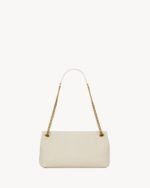 Featuring a sliding curb-chain strap, the bag may be worn on the shoulder.