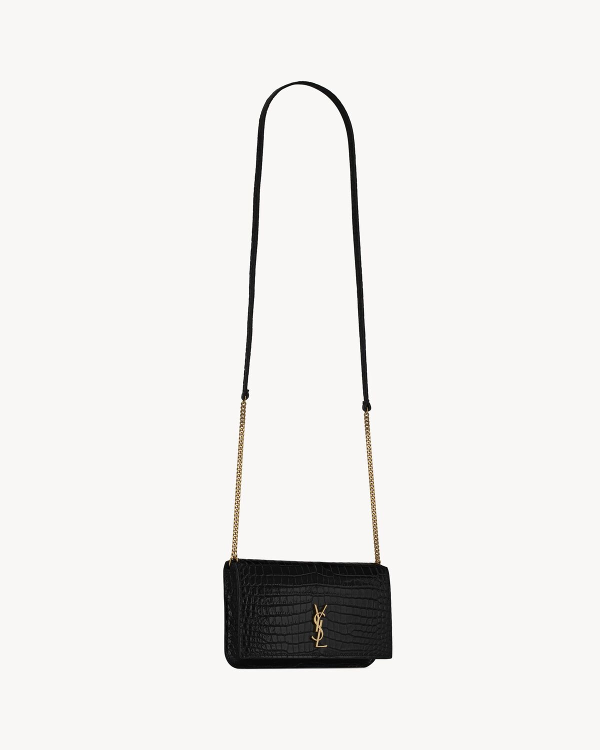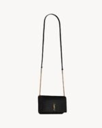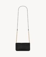 Cell phone holder with front flap decorated WITH THE CASSANDRE, featuring a leather and chain shoulder strap.
