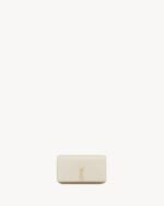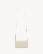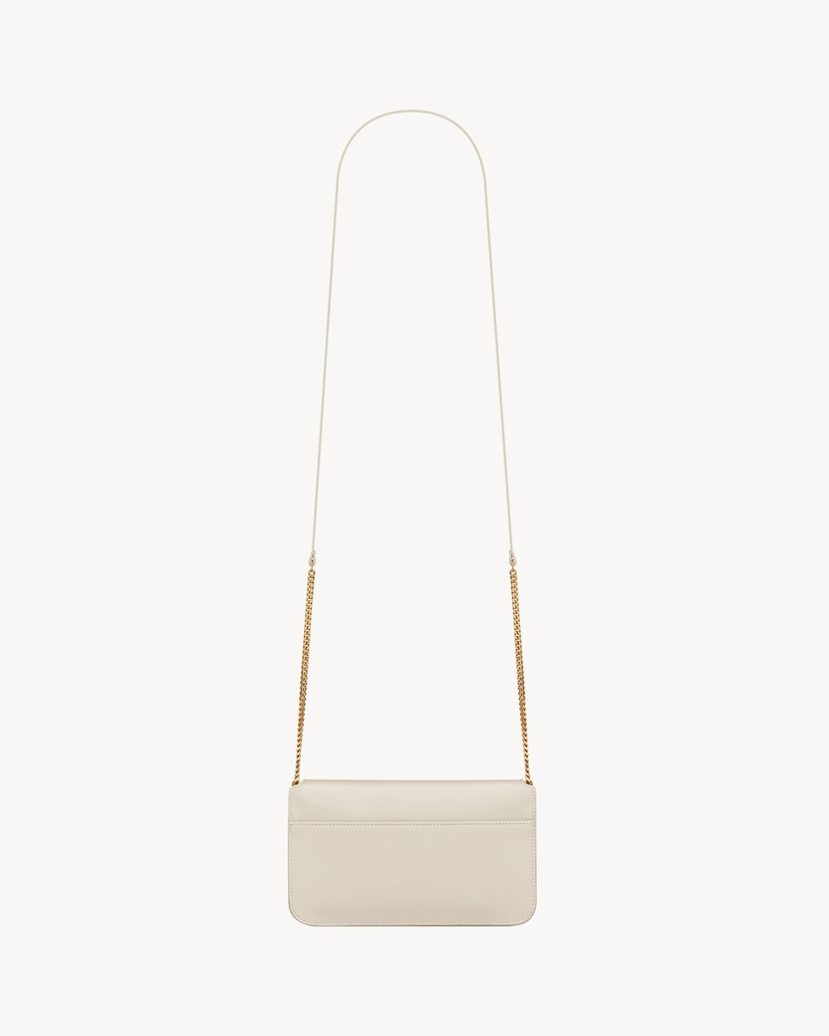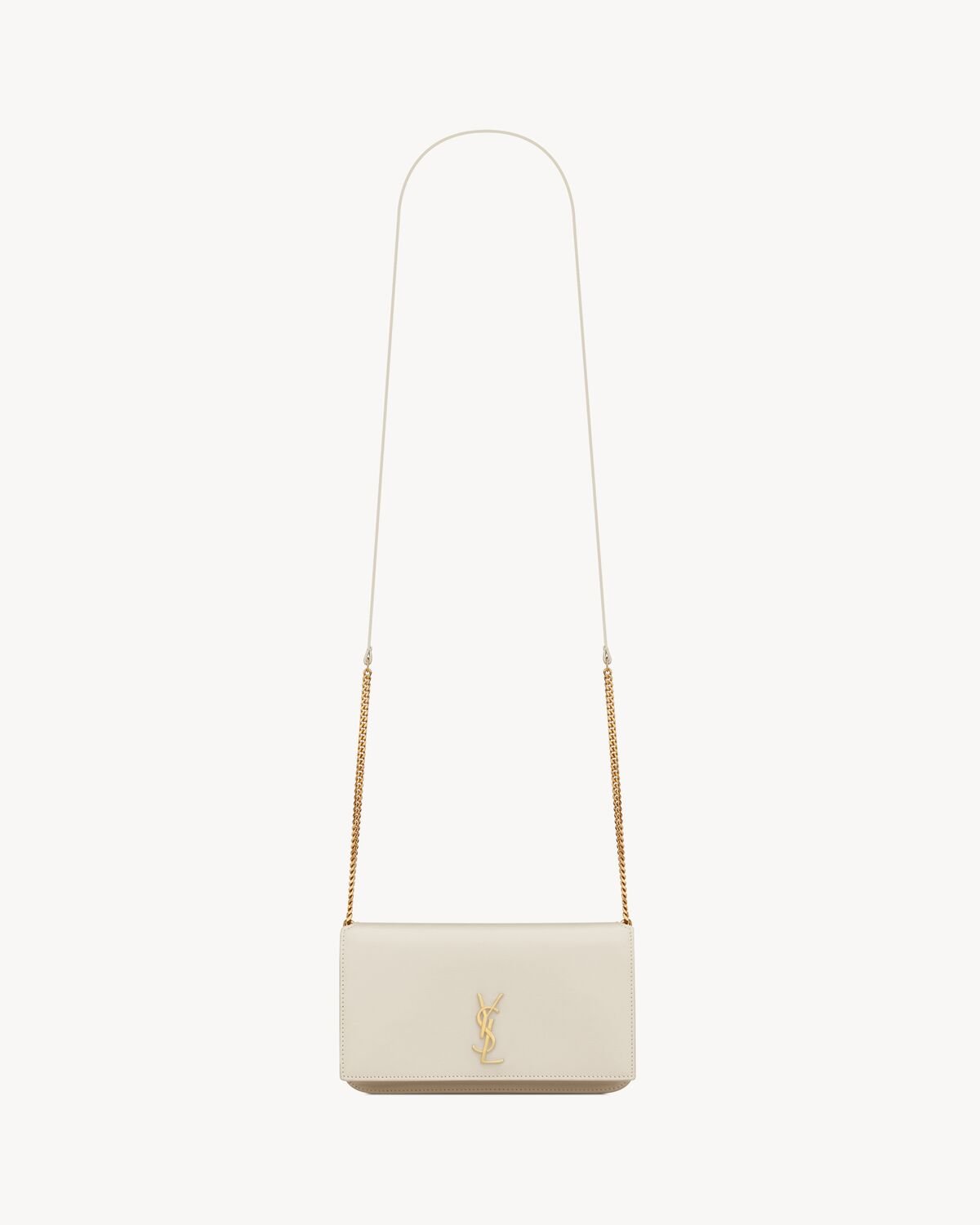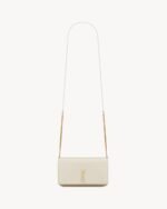Cell phone holder with front flap decorated WITH THE CASSANDRE, featuring a leather and chain shoulder strap.